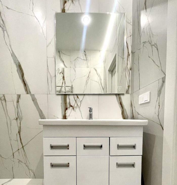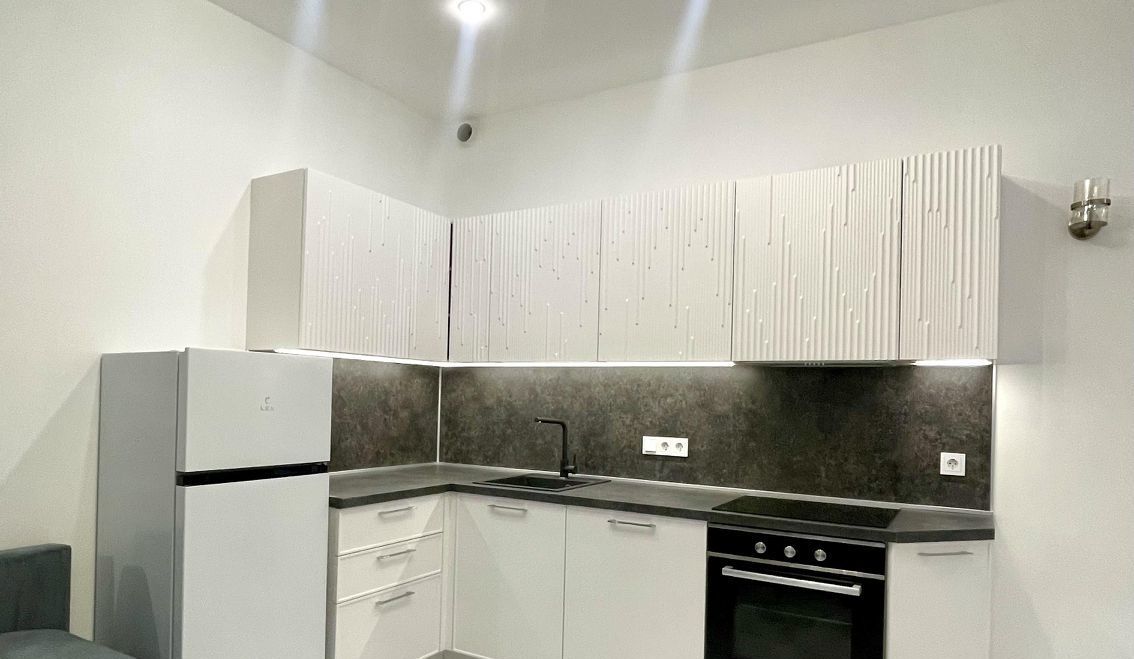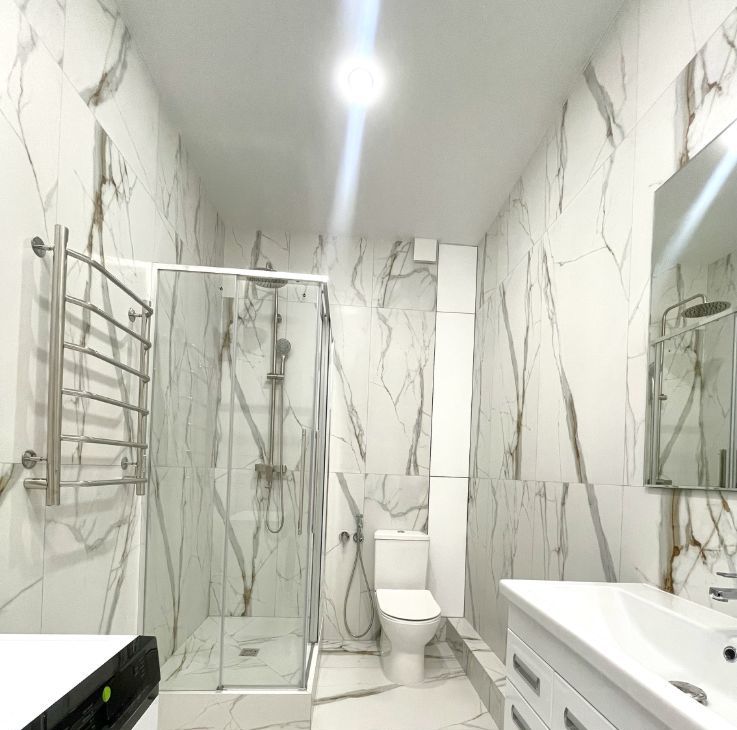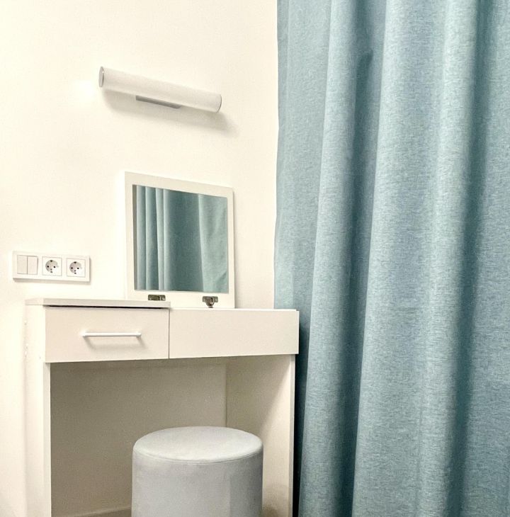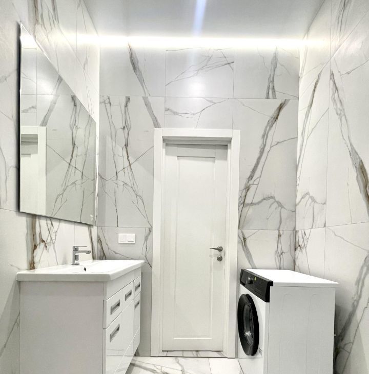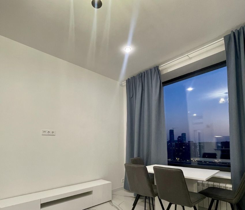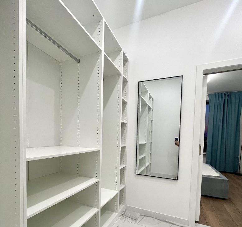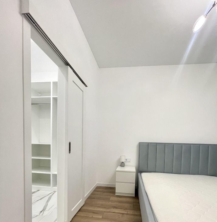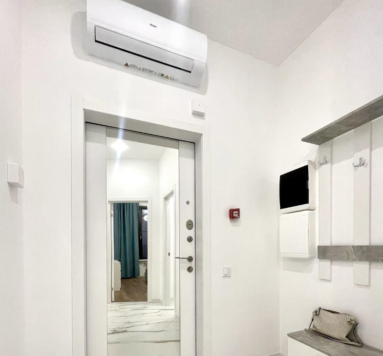В квартире есть все необходимое для жизни- встраиваемая техника, стиральная машина, кондиционер, гардеробная, просторная спальня с двуспальной кроватью.