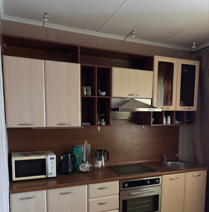 Кухня полностью оборудована. Двухкамерный холодильник, посудомоечная машина, духовка, встроенная варочная панель на 4 конфорки, микроволновка, чайник. Есть все самое необходимое, вплоть до посуды.