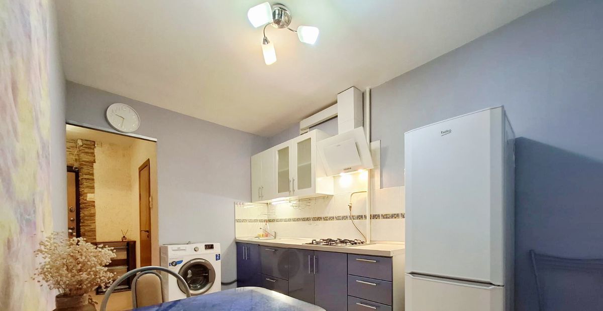 В кухне гарнитур, вырочная панель, вытяжка, 2х камерный холодильник, стиральная машина, обеденный стол, стулья.