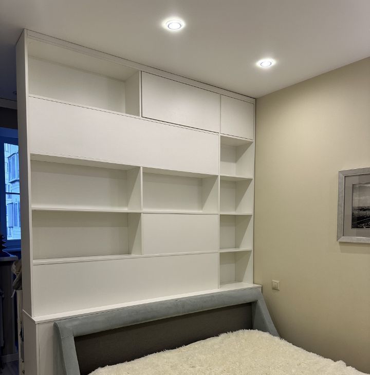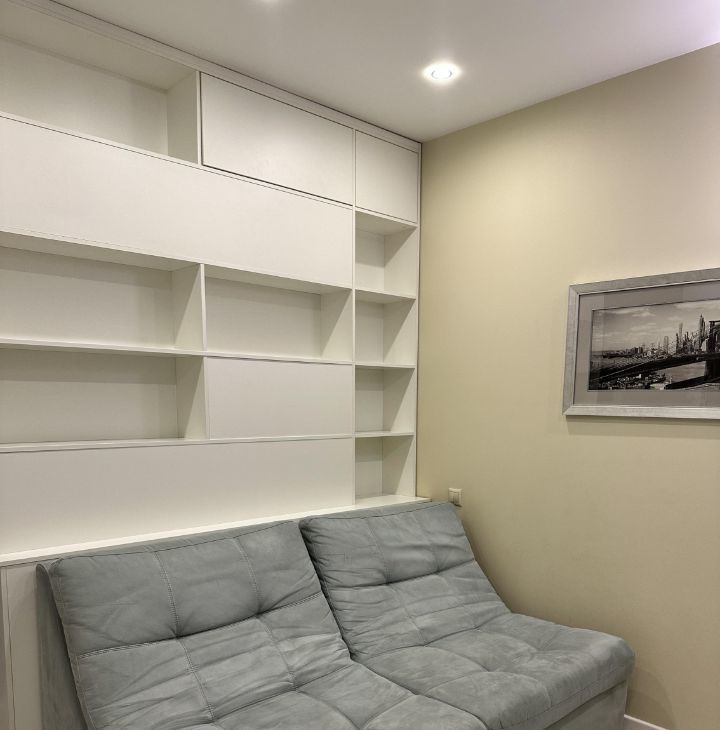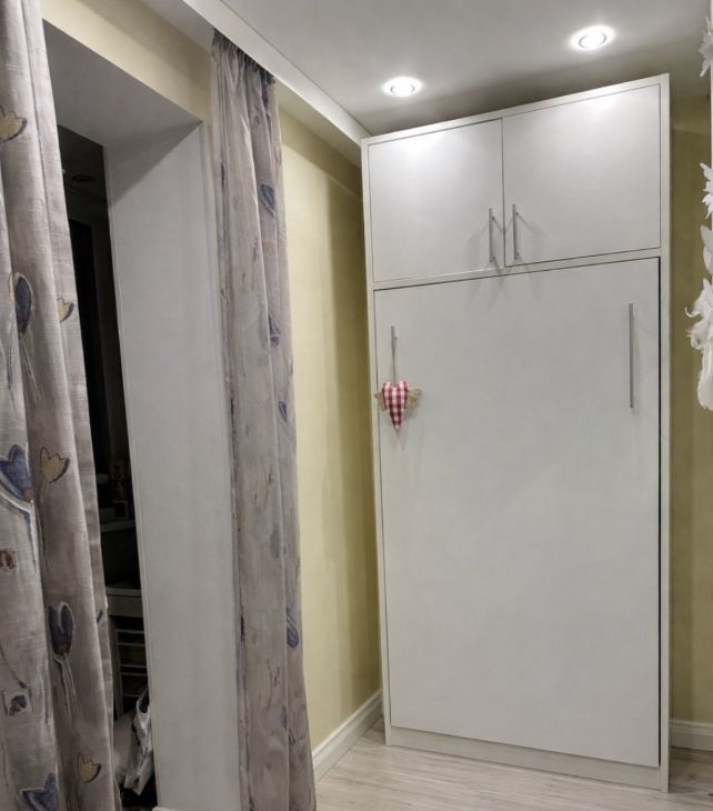 В комнате установлен телевизор и удобный диван, который превращается в кровать с матрасом, что заменяет полноценную кровать, матрас встроенный, а также вместительные шкафы для хранения вещей. За перегородкой установлено скрытое спальное место - шкаф - кровать, дополнительное место для сна , для одного человека. Так же можно не использовать, и поставить детскую кроватку.