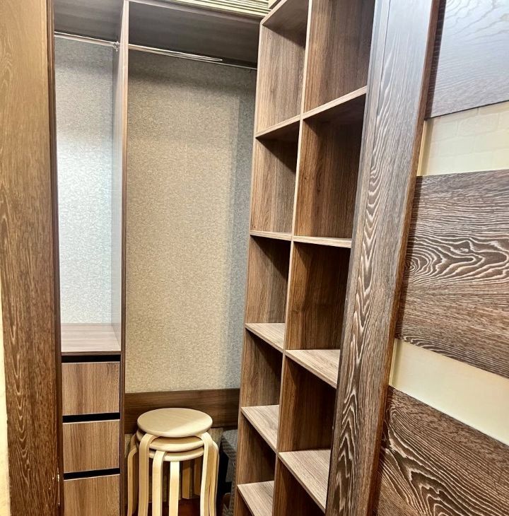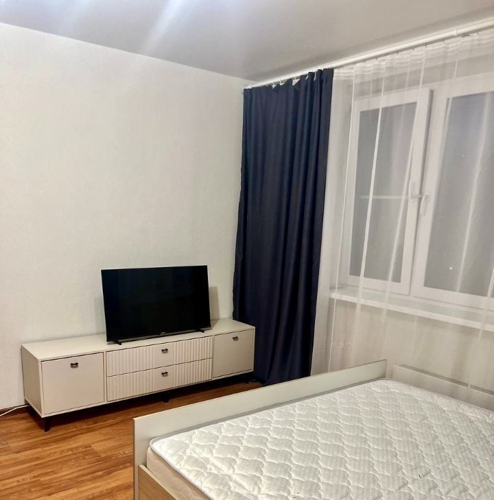 В квартире гардеробная. Прихожая. Двуспальная кровать. Тумба с тв.