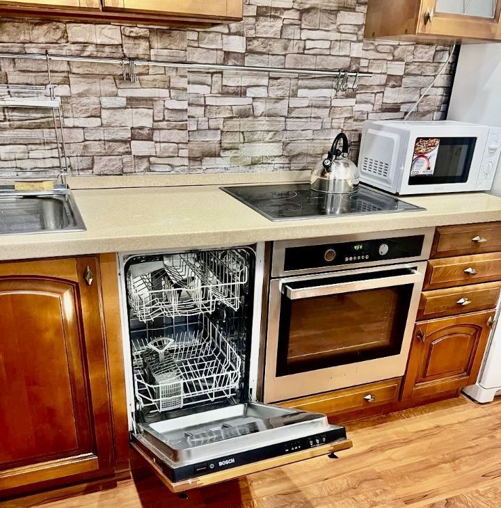 Кухня. Посудомоечная машина, холодильник, микроволновая печь, чайник.
