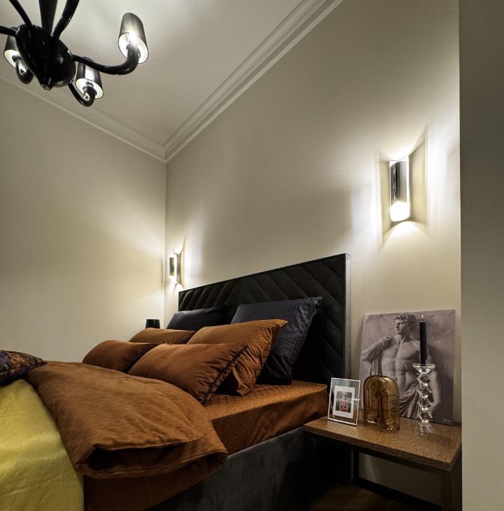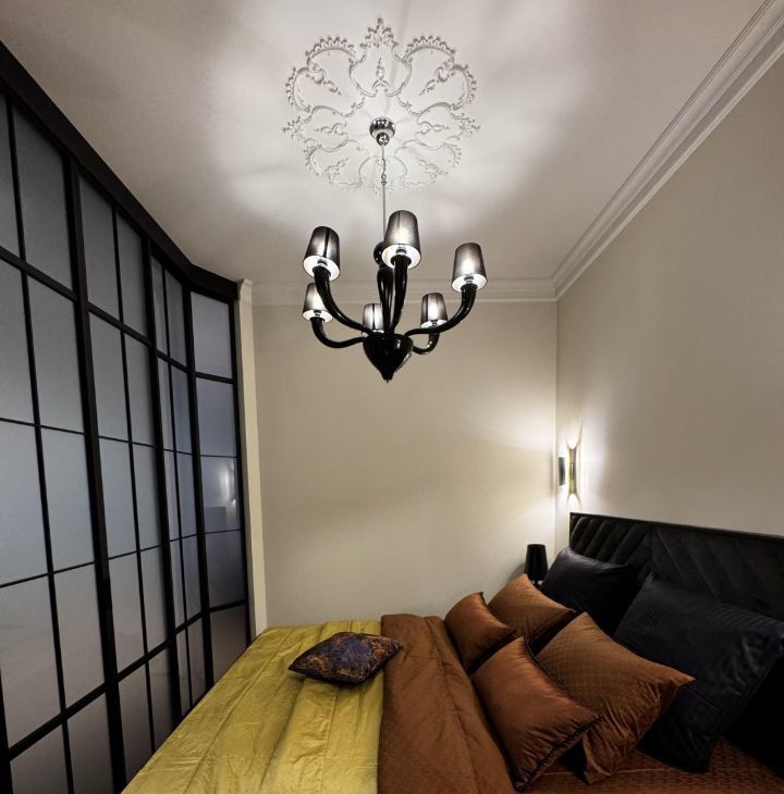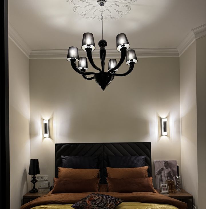Кровать с ящиком для белья Milano Garda Decor. Ортопед.матрац (160*200) Nuvola Salute. Столики Twills (Италия). Люстра Муранского стекла Omega Vetreria Artistica rosa (Италия). Бра La redoute (Франция).