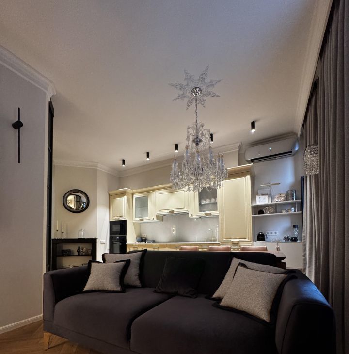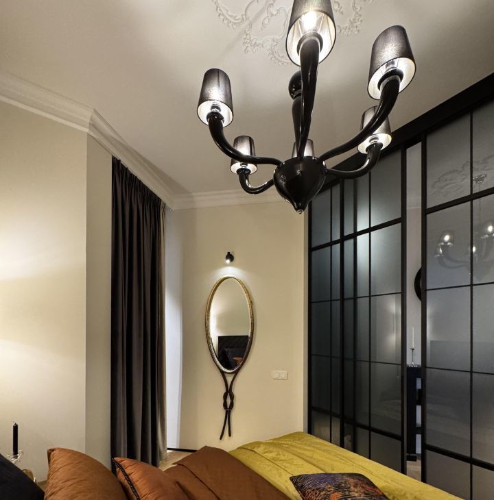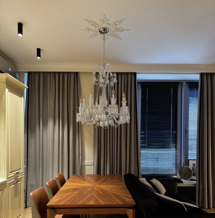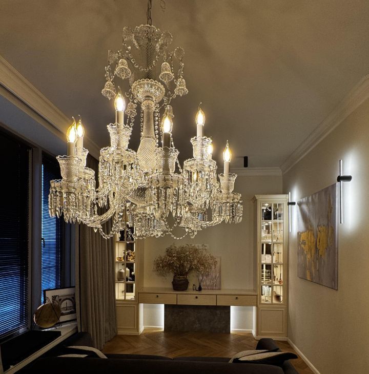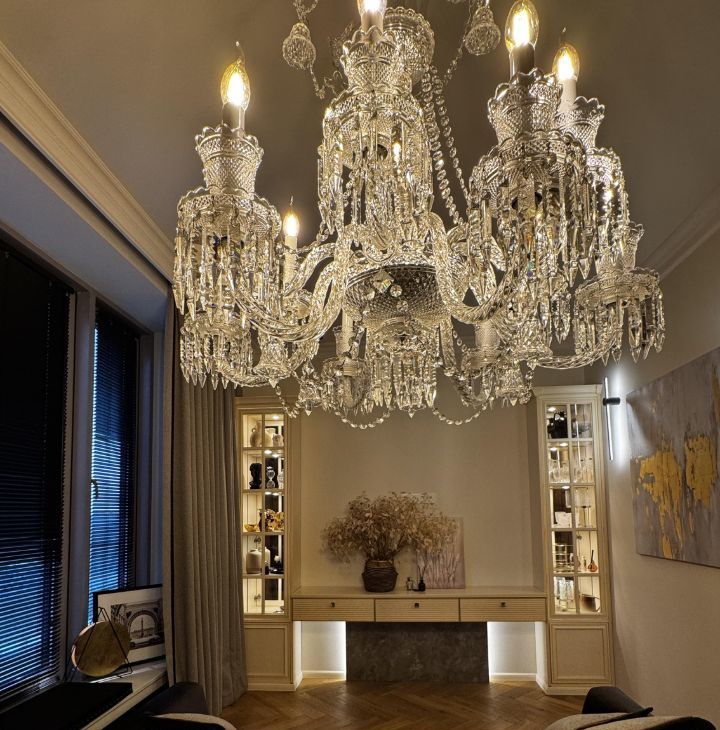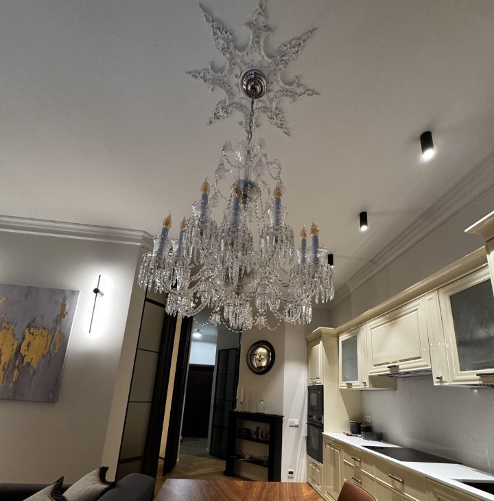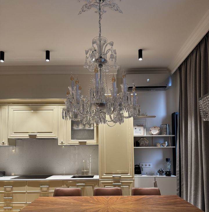 Стулья Garda Decor. Шкаф, полка настенные Piedra. Стеллаж приставной, зеркало сферическое - La redoute (Франция). Люстра реплика Baccarat Zenith (Филиппины). Бра Stili dArte (Италия).
