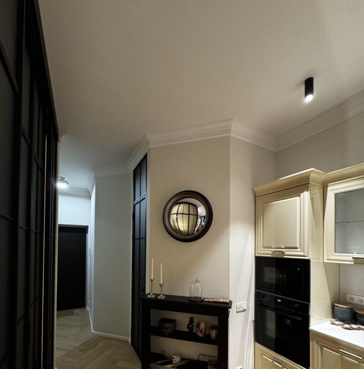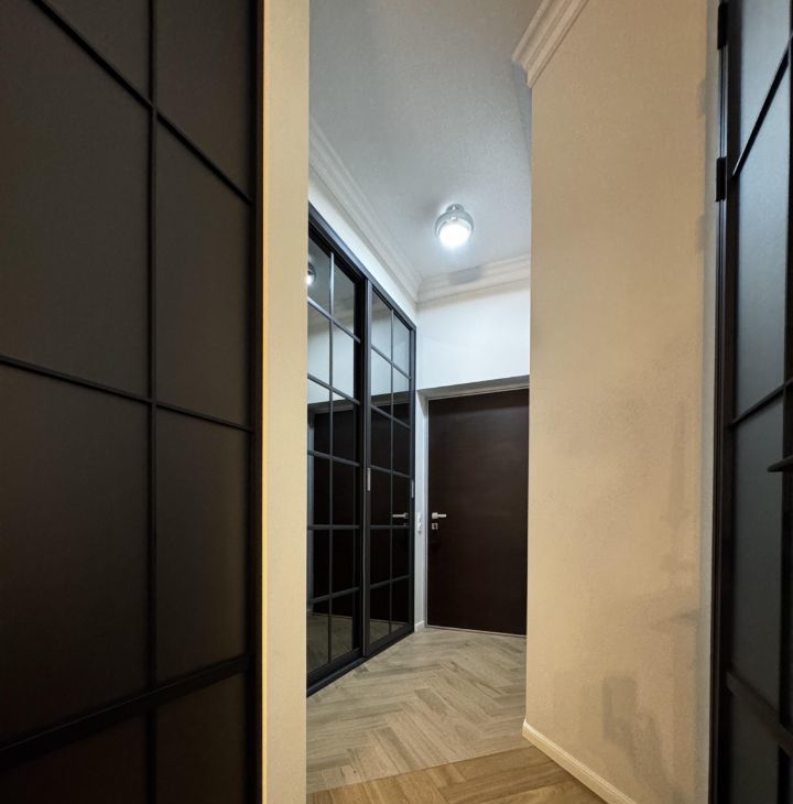 Паркет - Английская елка Kahrs Herringbone Дуб CD Smoked Grey Lively (Швеция). Керамогранит Rive Acgua riva AtlasConcorde Russia, резаный в плашки, как паркет. Теплые электрич.полы везде, где керамогранит. Натуральная гипсовая лепнина по проекту на заказ (розетки, молдинги, карнизы, аква-карнизы). Краска Sherwin-Williams sw 6147 Panda White (cша). Плинтуса - дюрополимер, алюминий, по проекту. Розетки, выключатели-Berker (Германия). Перегородка, дверь раздвижная в спальню, дверь в с/у - алюминиевые конструкции выполнены на заказ. Весь корпус - Mr. Doors.