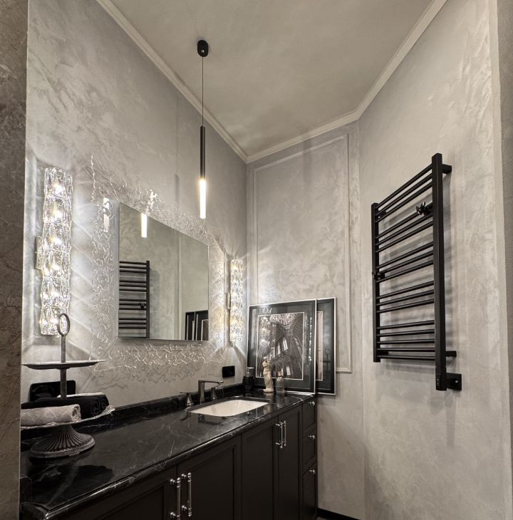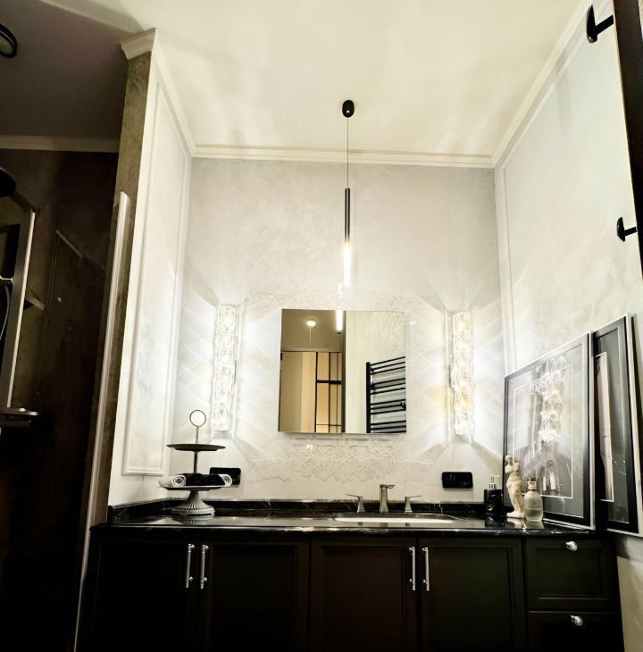 Стирально-сушильная машина H.Point Ariston. Мебель-Mr. Doors. Мраморная столешница- Nero Marquina. Зеркало Colico design (Италия). Картины на заказ.