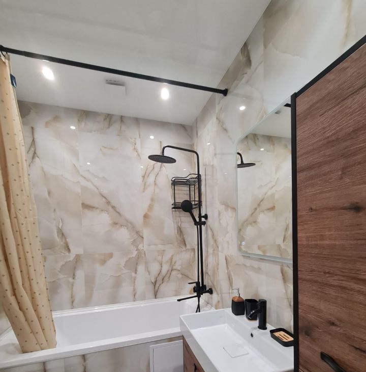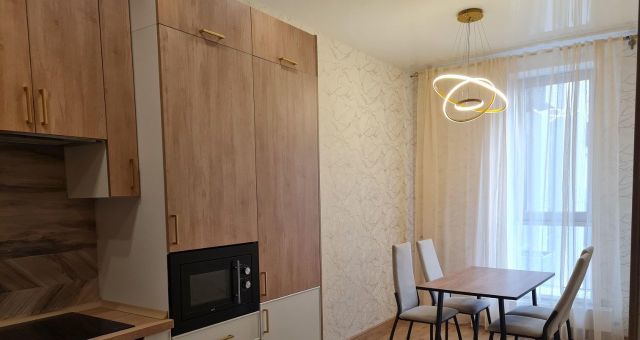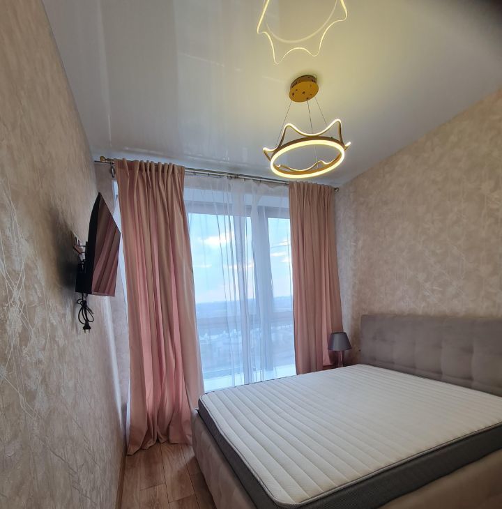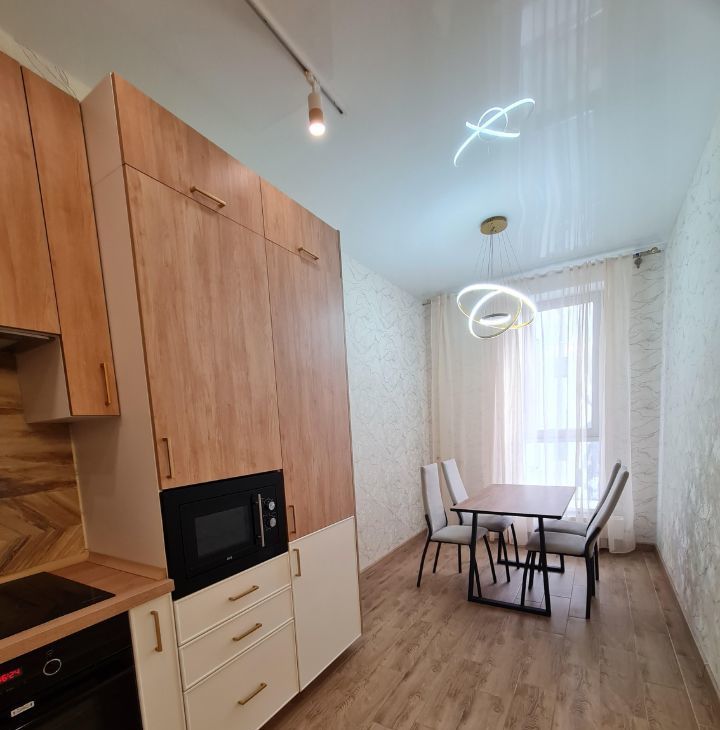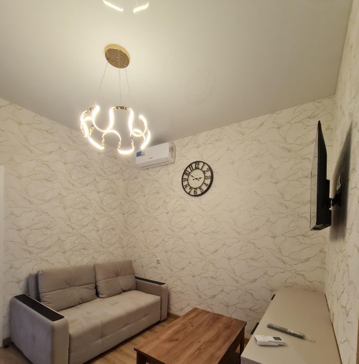Квартира оформлена в современном стиле с качественным евроремонтом. В комнате и на кухне есть вся необходимая мебель для комфортного проживания. Техника включает в себя кондиционер, холодильник, посудомоечную и стиральную машины, а также телевизор. Санузел совмещенный, оборудован ванной. Окна выходят во двор, поэтому в квартире тихо и спокойно.