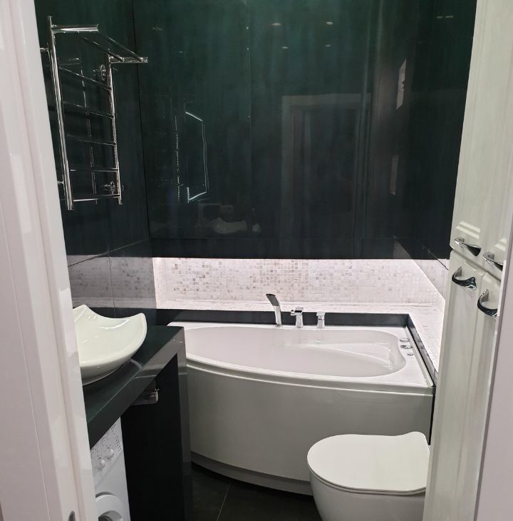 *Санузел совмещенный: ванна с гидромассажем, инсталляция, встроенный высокий шкаф, стиральная машина, теплый пол.