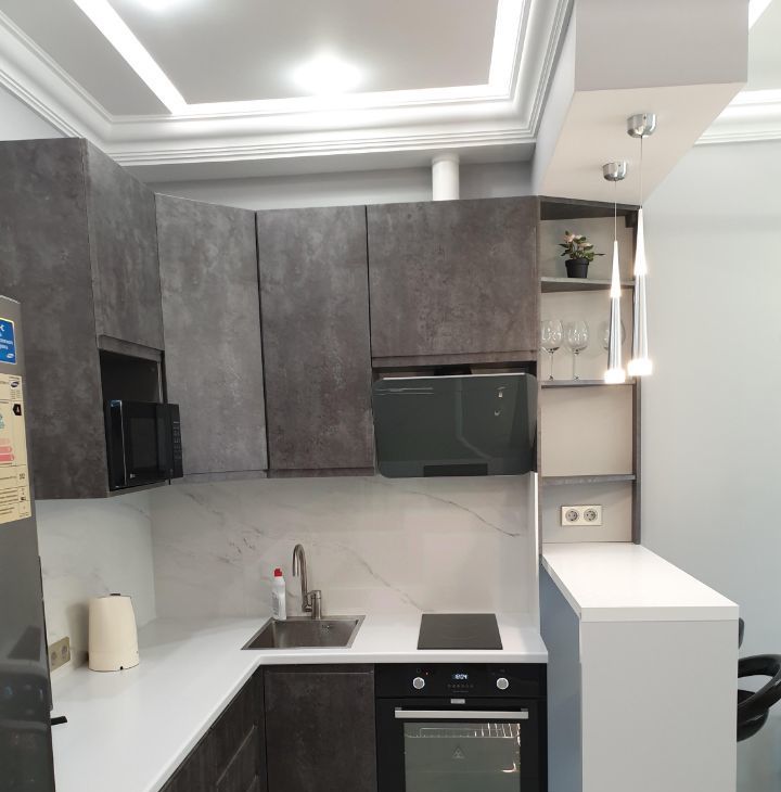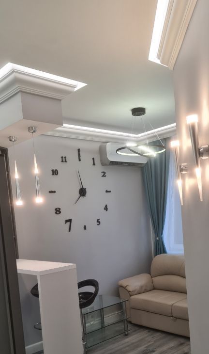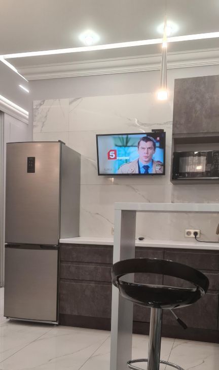 *Кухня-гостиная: кухонная мебель под единой столешницей с барной стойкой, кожаный диван-кровать. Посудомойка, духовой шкаф, варочная панель, микроволновка, холодильник и 2-ой смарт-ТВ.