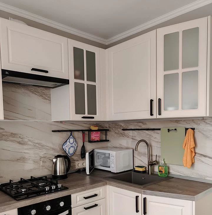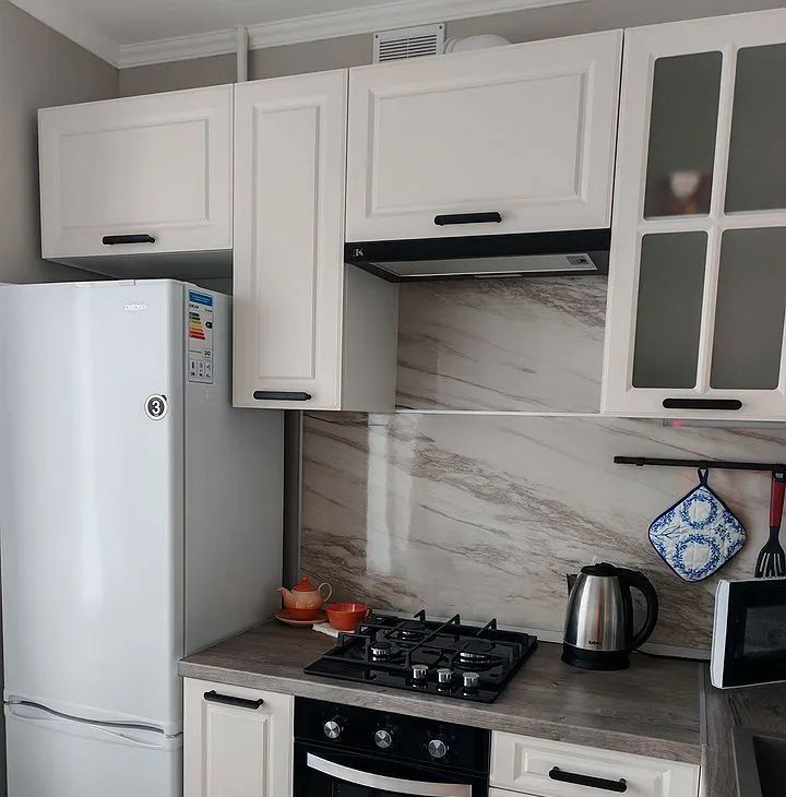 Кухня: новый гарнитур с подсветкой рабочей зоны, холодильник, микроволновая печь, электрический чайник, газовая варочная панель, электрическая духовка, вытяжка, обеденный стол с двумя стульями.
