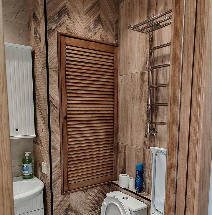 Ванная комната оснащена ванной и стиральной машиной. Под раковиной и над ней — удобные шкафчики для хранения.