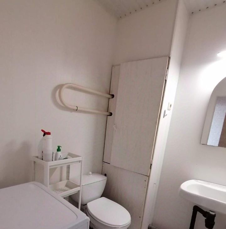 переносное зеркало, на кухне установлен кухонный гарнитур под единой столешницей + обеденная группа, из бытовой техники электрическая плита, холодильник, стиральная
