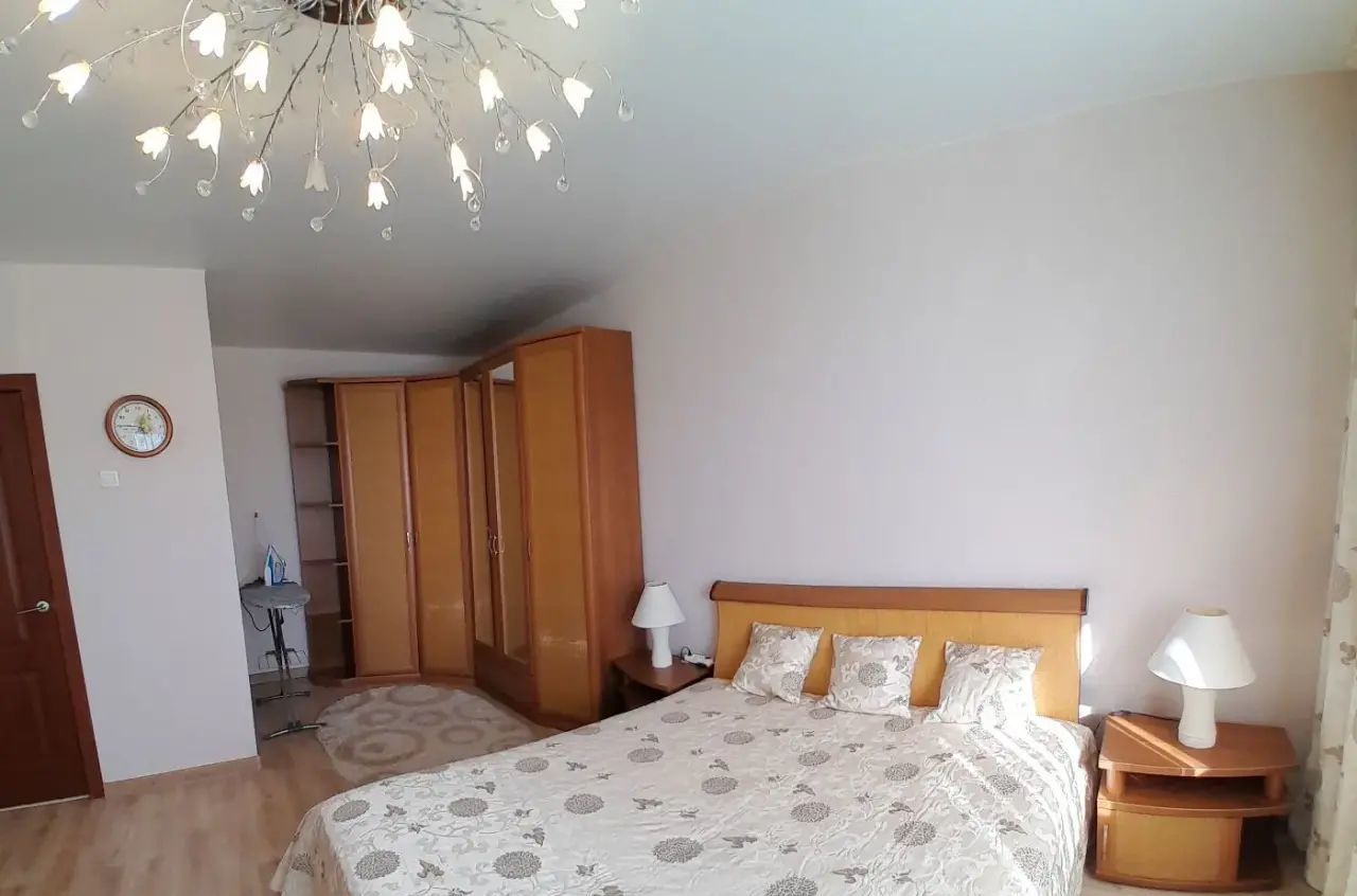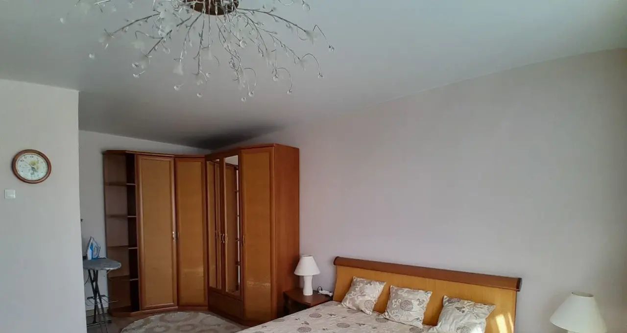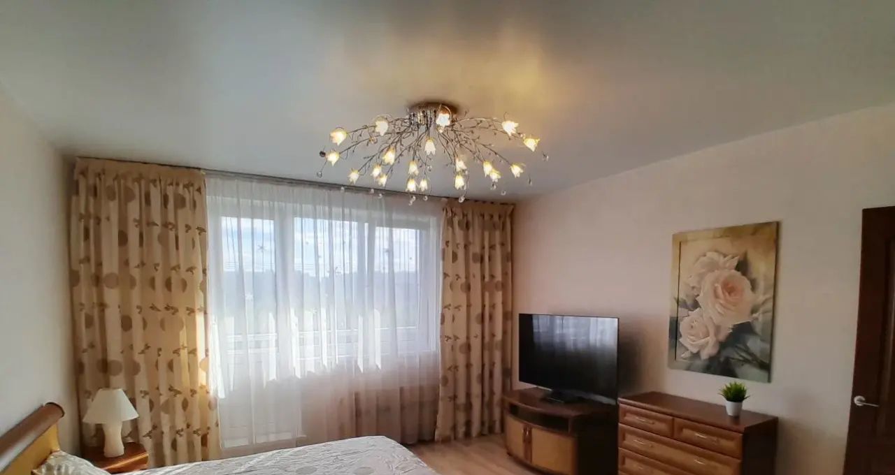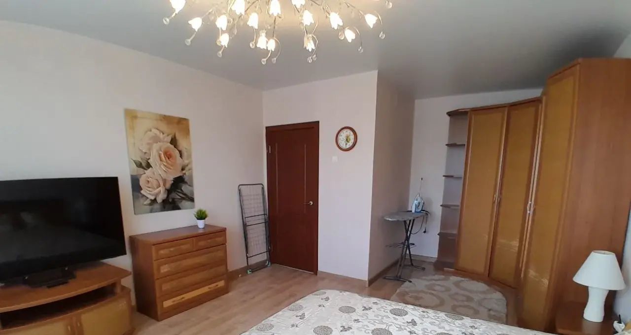 В комнате 2-х спальная кровать, просторный угловой шкаф купе, ТВ плазма, потолки натяжные.
