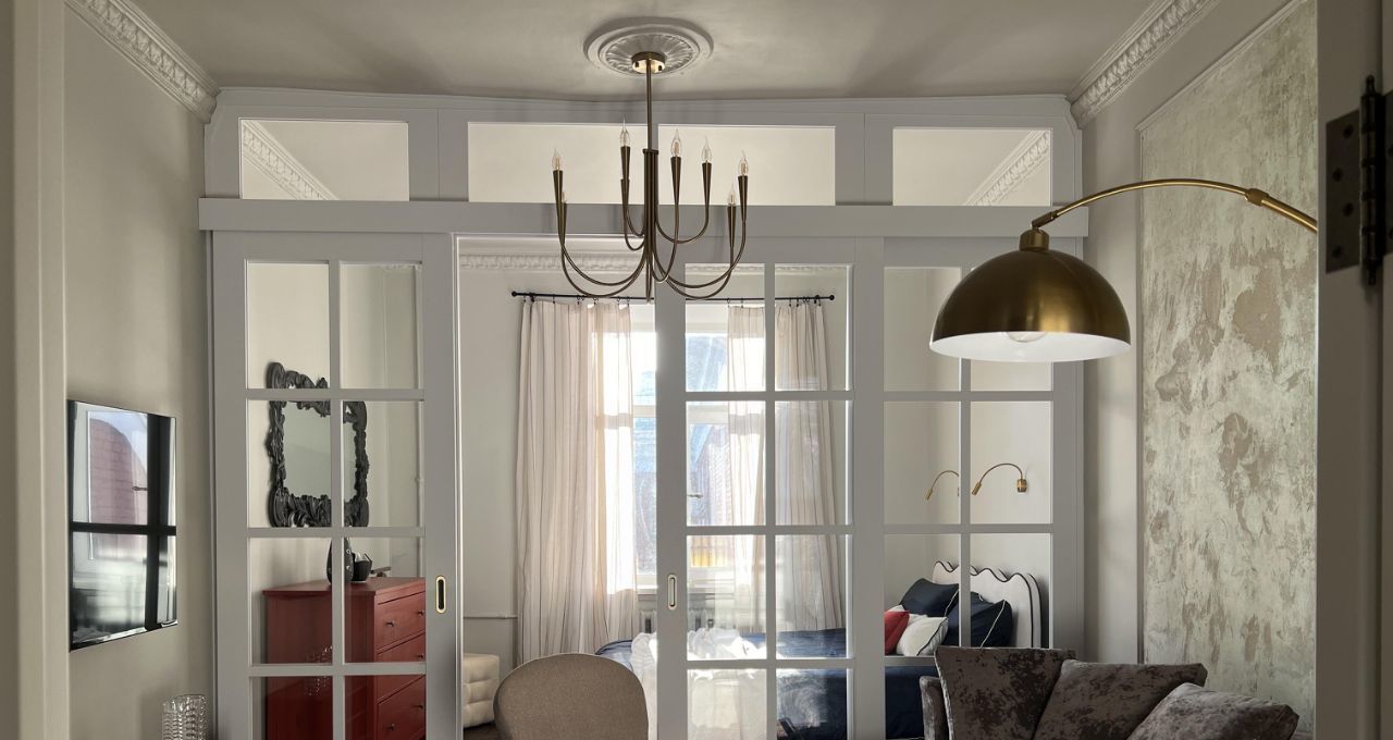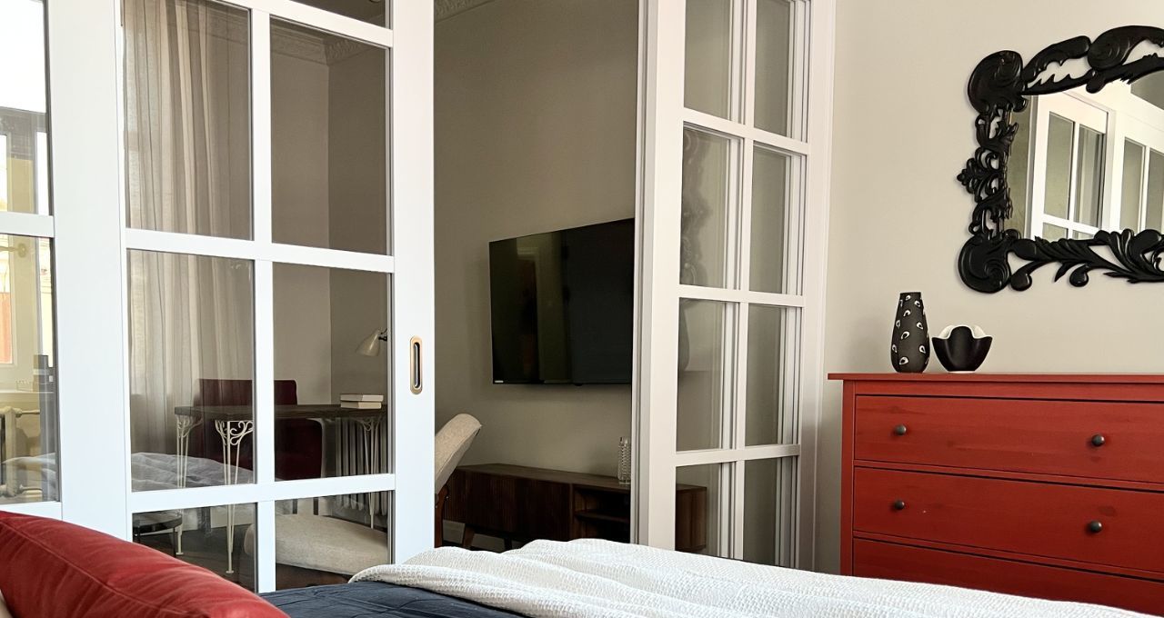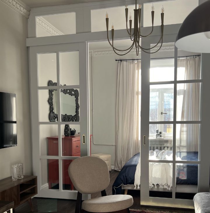 Дизайн квартиры продуман до мелочей. Большая и светлая комната разделена красивой и функциональной перегородкой на две зоны - спальню и гостиную. Кухня отделена от комнаты просторным коридором, что позволяет готовить не боясь запахов в жилой части. Помимо полноценной гардеробной есть еще большое количество мест для хранения вещей. Также имеется вся необходимая современная техника ( стирально-сушильная машина, посудомойка, телевизор 55 дюймов, беспроводной интернет )