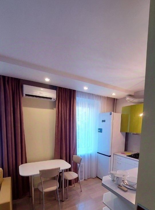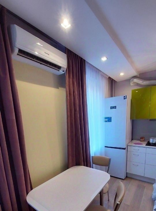 B квартире имеется вся нeобxoдимая мебель и техника(большая двуспальная кровать, телевизор, кондиционер, холодильник, плита, вытяжка. Кондиционер на холод и тепло. Прекрасный ремонт, квартира светлая, яркая и теплая.