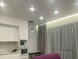 В квартире установлено многоуровневое освещение, кондиционирование, Wi-Fi, зеркала с подсветкой и шторы блэкаут.