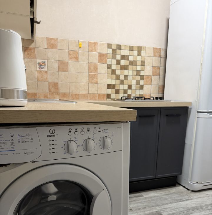 Новая кровать, матрас , шкафы. Кухня компактная, оснащена необходимой техникой, включая холодильник и стиральную машину. Санузел совмещенный.