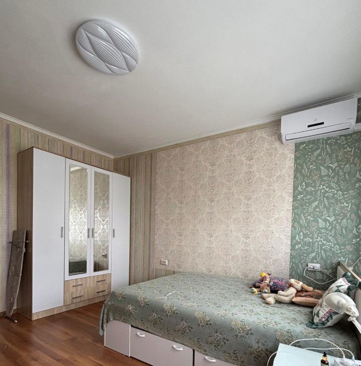 В комнате установлен кондиционер, шкафы для хранения вещей и двуспальная кровать. В кухне имеется вся необходимая бытовая техника, включая холодильник, микроволновую печь и стиральную машину. Санузел раздельный, оформлен в светлых тонах.