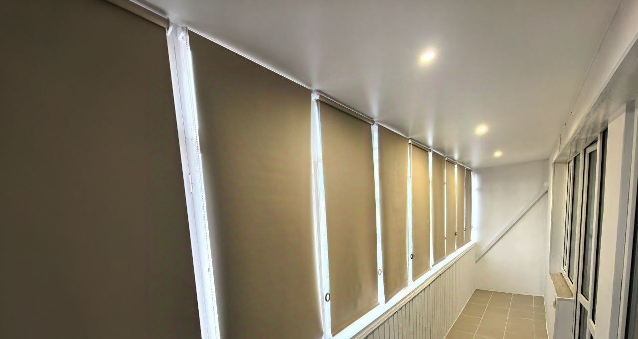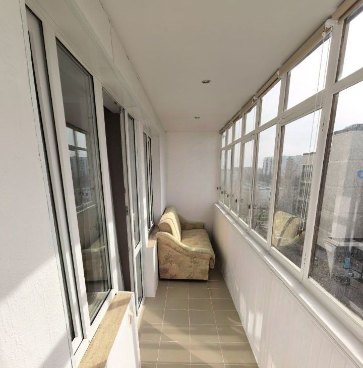 Большая застекленная лоджия с плиточными полами, ролл-шторами блэкаут и диваном.