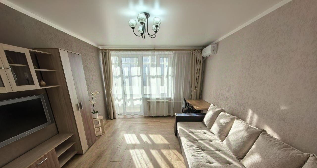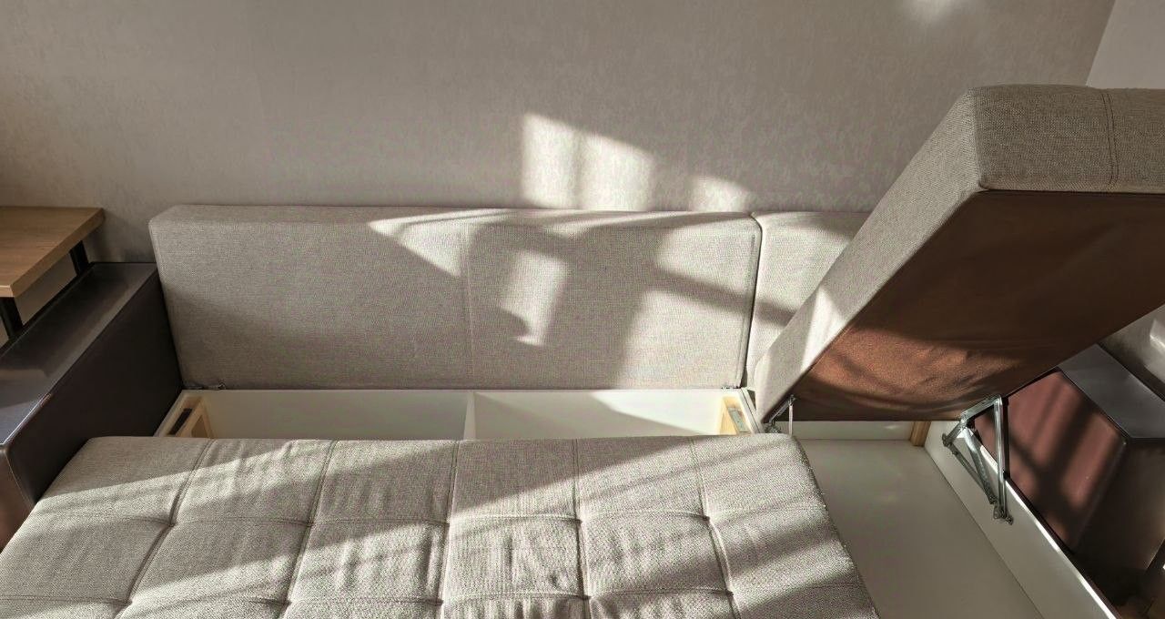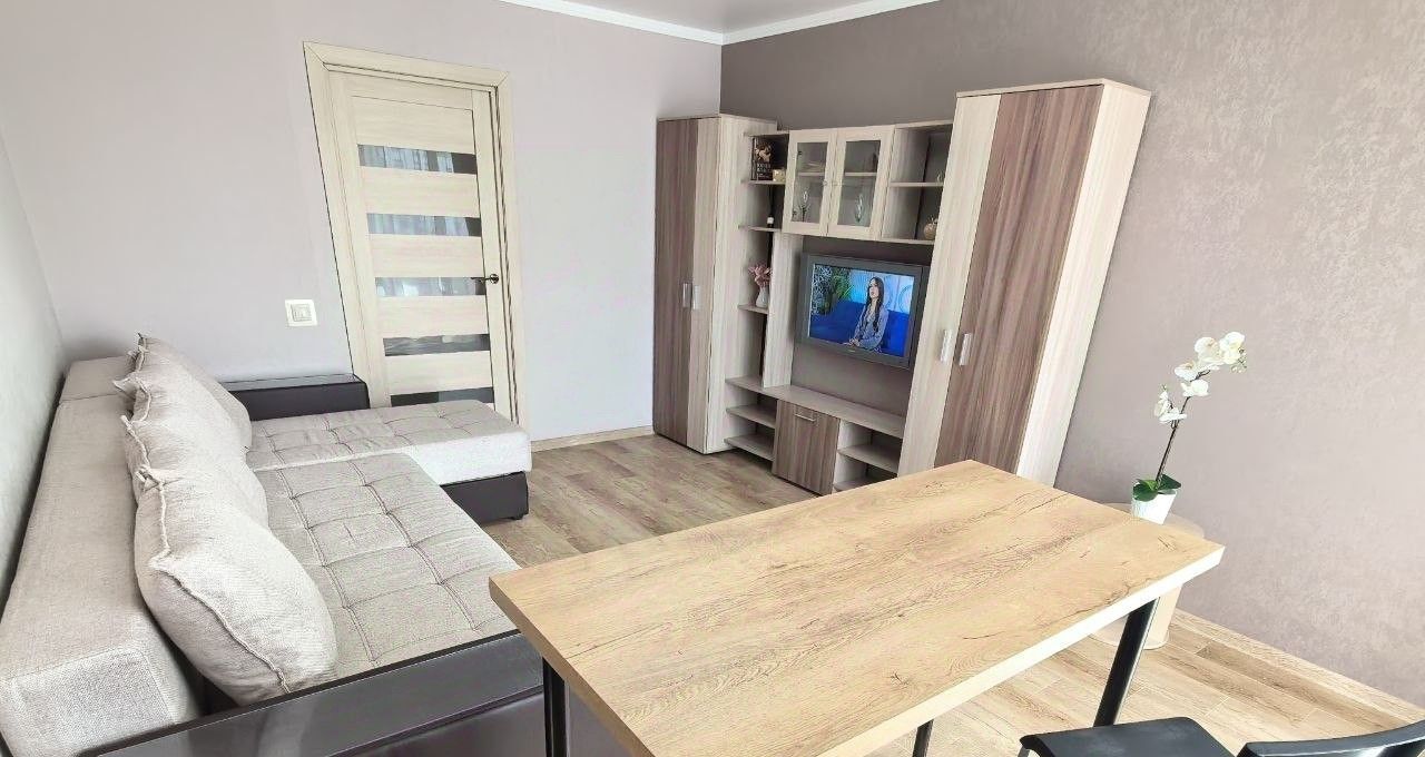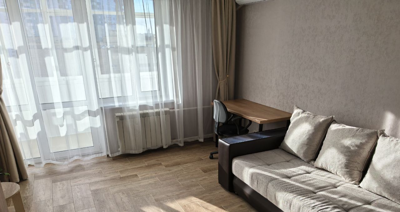 Большая комната с раскладным диваном и рабочим столом, который можно превратить в барную стойку.