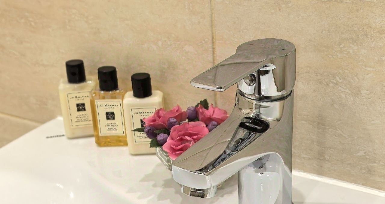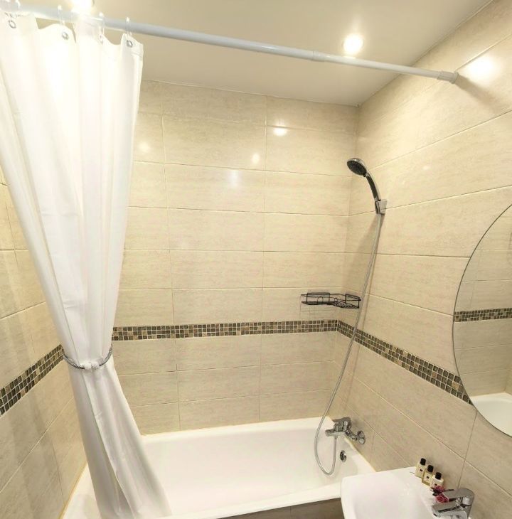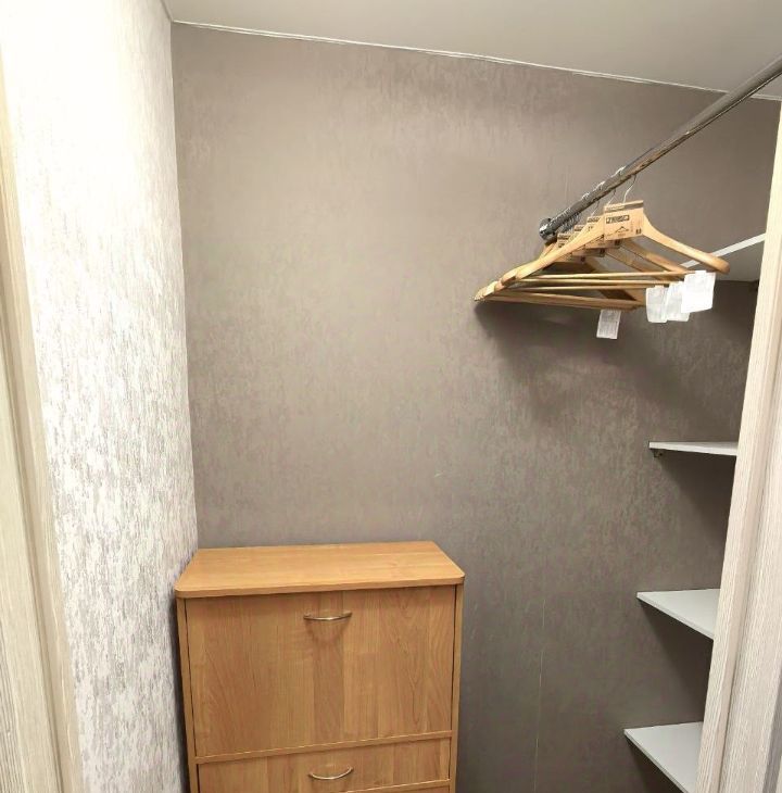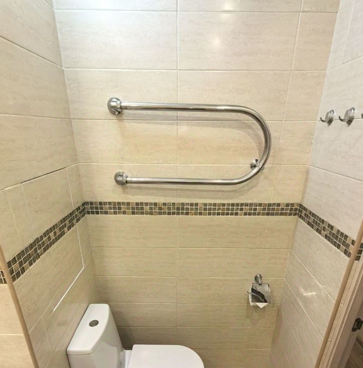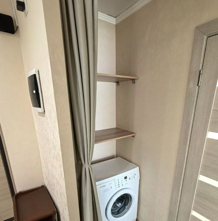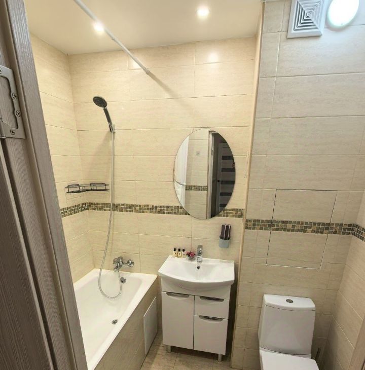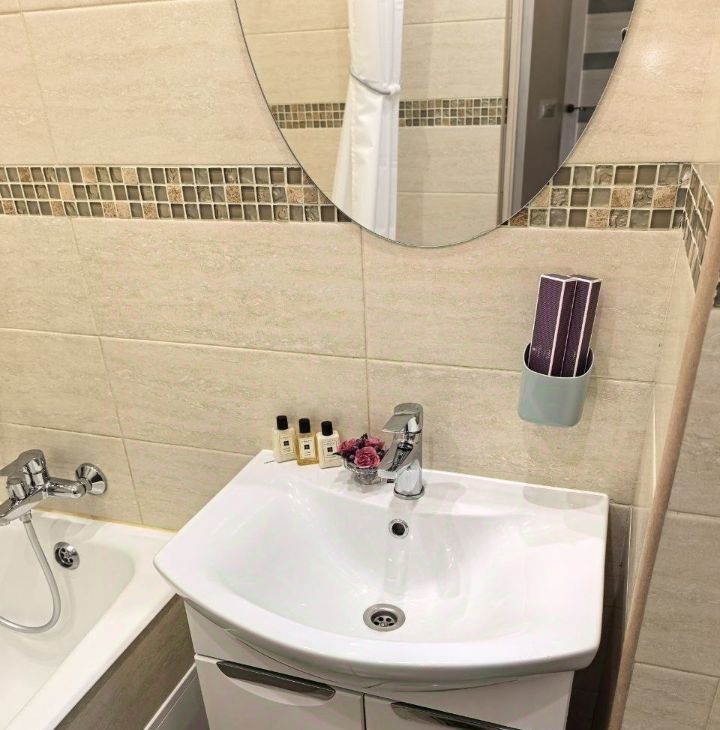 Просторный санузел в плитке до потолка, везде новые смесители. Стиральная машина Bosch спрятана в прихожей. Еще одно преимущество этой однушки, это наличие гардеробной комнаты.