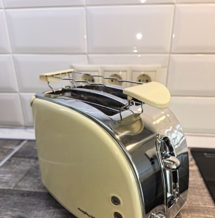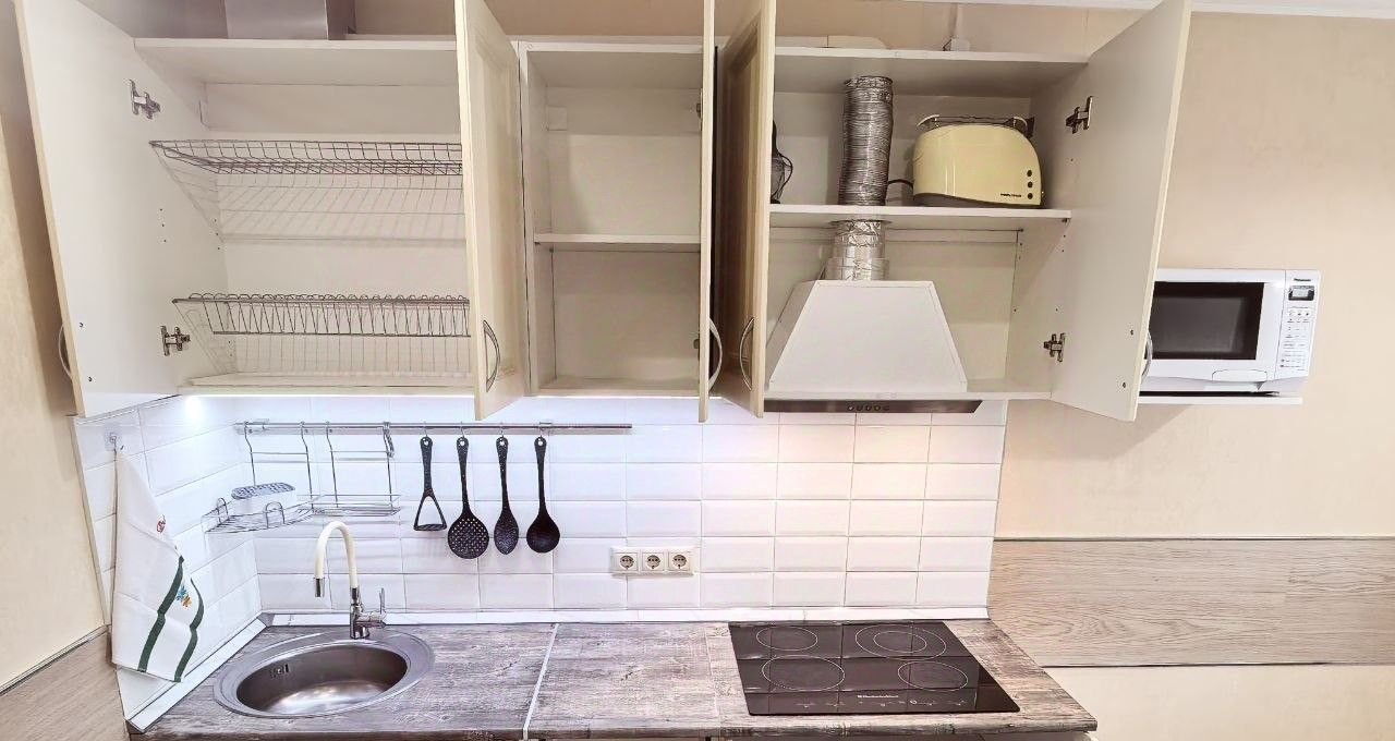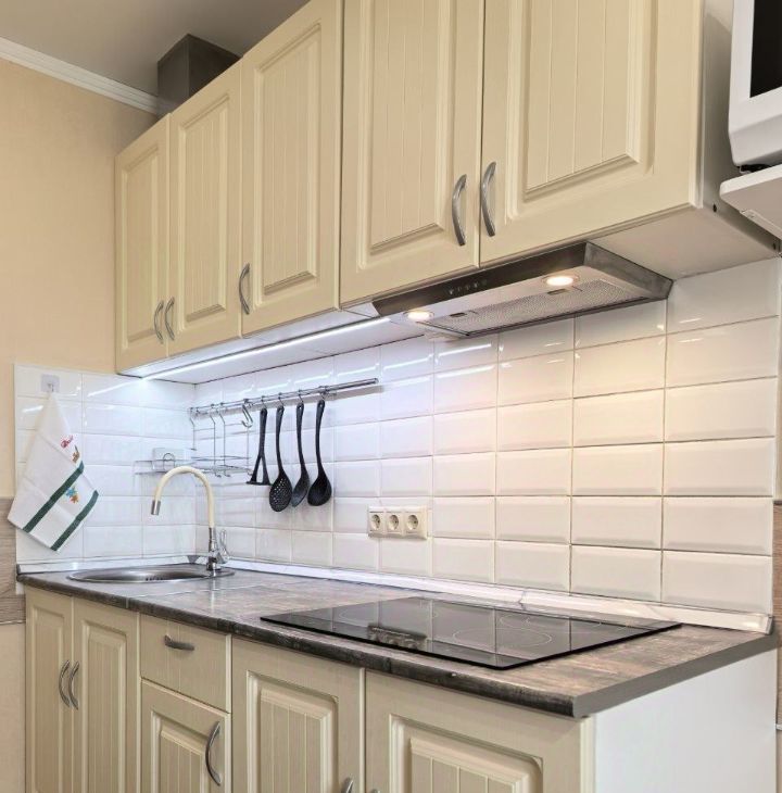 Кухня продумана до мелочей: раздвижной стол IKEA, новый диван-кровать раскладывается в полноценное спальное место, чайник JVC с поддержанием нужной температуры (для правильного чая и кофе) и тостер Morphy Richards. СВЧ, вытяжка, подсветка рабочей зоны