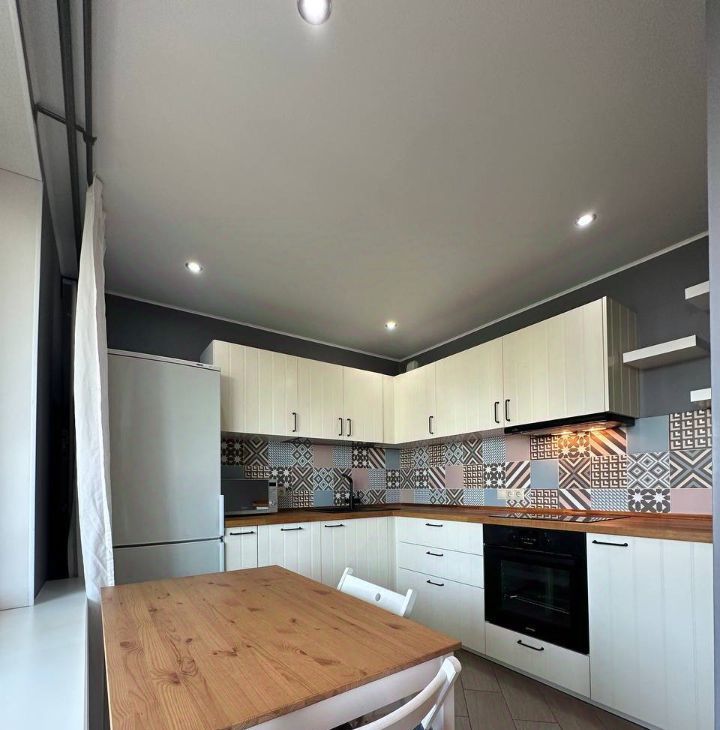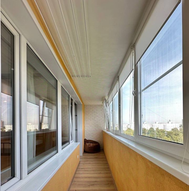 Внутри аккуратный живой ремонт: квартира видела жизнь, а не только дизайнерские мудборды. Кухня рабочая — посудомойка, холодильник, микроволновка, чайник; за столом помещаются и ужин вдвоём, и дружеские обсуждения смысла жизни. Комната с диваном и кондиционером — температура и планы на вечер регулируются отдельно. Балкон большой, 6 м²: летний кабинет.