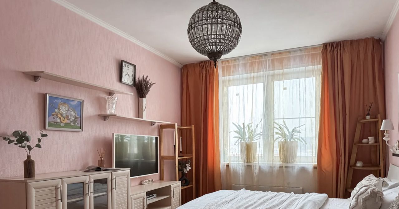 Планировка квартиры продумана и удобно зонирована. В спальне организовано пространство для отдыха и работы: установлена удобная кровать, кресло, телевизор и рабочий стол. Для хранения предусмотрены вместительный шкаф, комод и стеллажи. Кухня разделена на обеденную зону и зону отдыха с диваном и телевизором. Из окон открывается приятный вид на город.