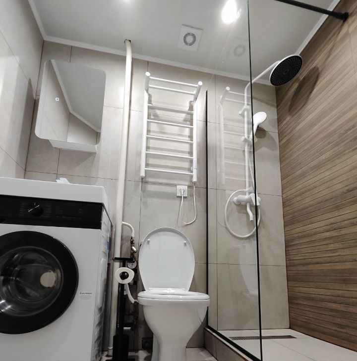Санузел совмещенный, оснащен душевой кабиной и стиральной машиной. Теплый пол в ванной и в лаундж-зоне.