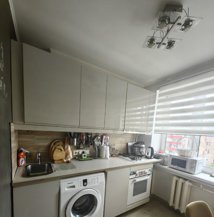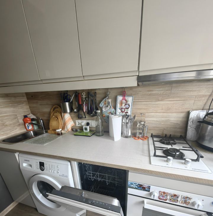 Кухня: кухонный гарнитур + посудомоечная машина, стиральная машина, варочная панель, микроволновая печь, холодильник, имеется посуда.
