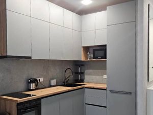 - Встроенный кухонный гарнитур: электрическая плита с варочной панелью и встроенной вытяжкой. Установлен фильтр питьевой воды. мультиварка Richmond, чайник Bosch и аэрогриль Hotter, хорошая дорогая посуда. Духовой шкаф с СВЧ. Просторная обеденная зона. Полка с подсветкой будет установлена на днях (в пути).