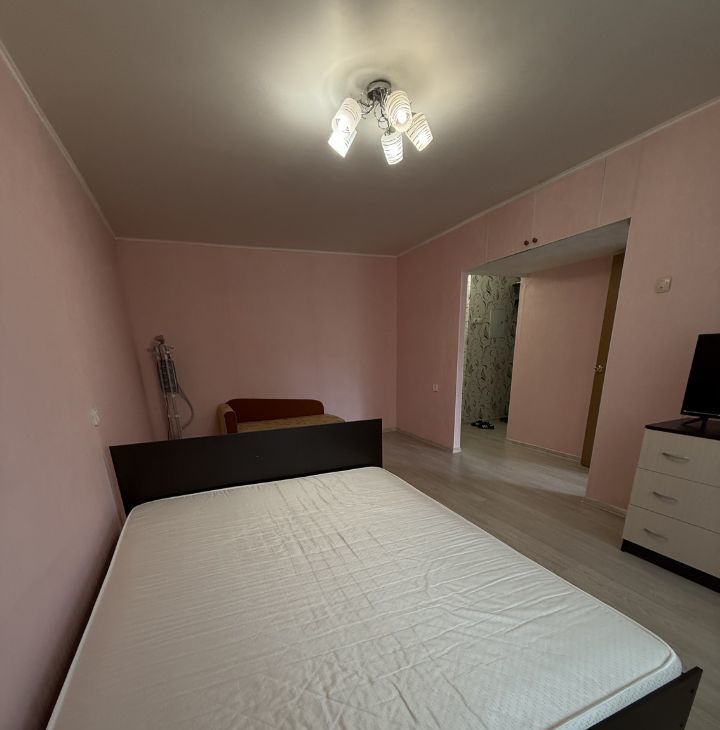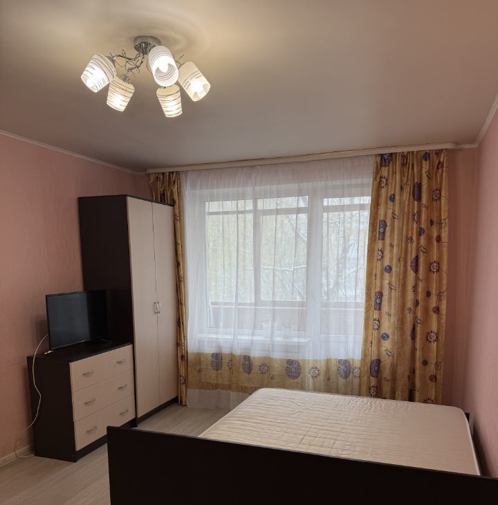 В комнате удобная двуспальная кровать с новым ортопедическим матрасом, шкаф для одежды, тумба, телевизор.