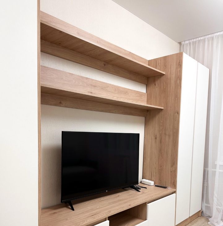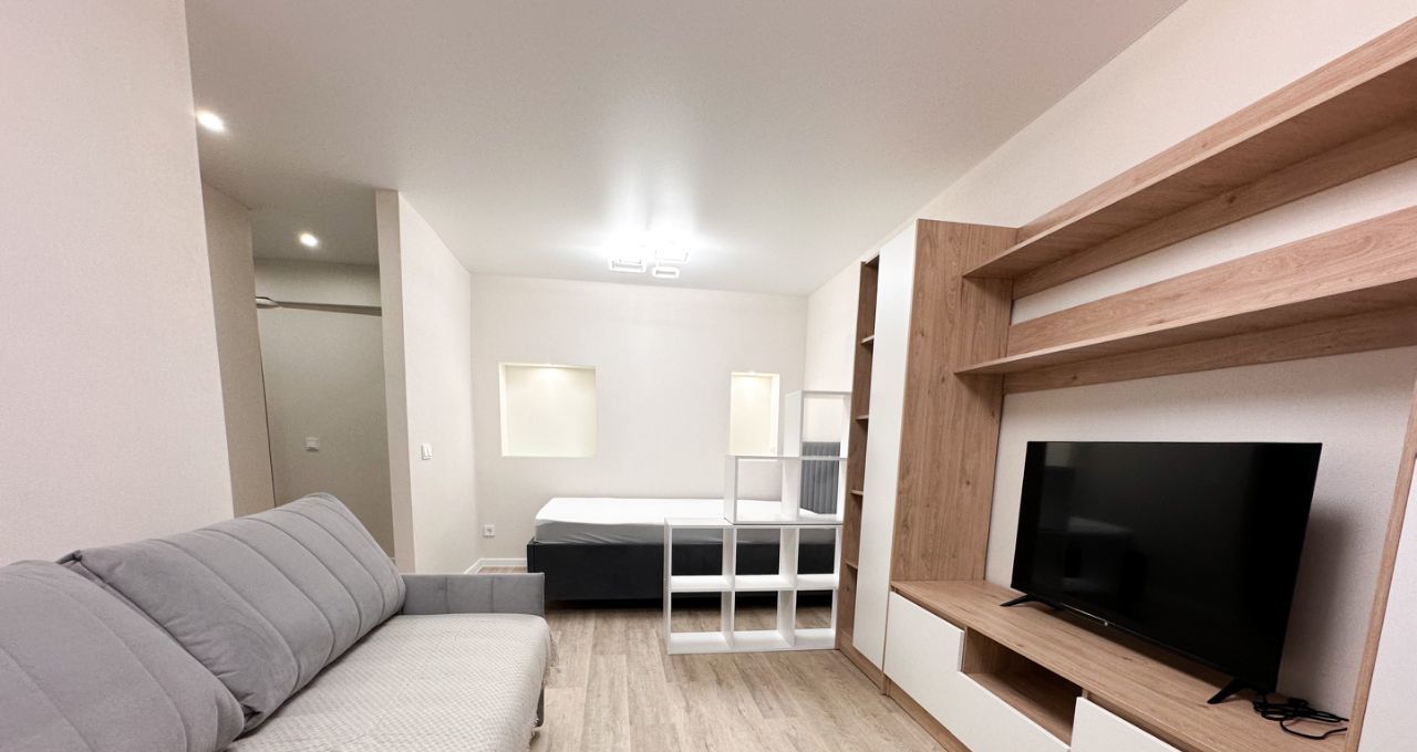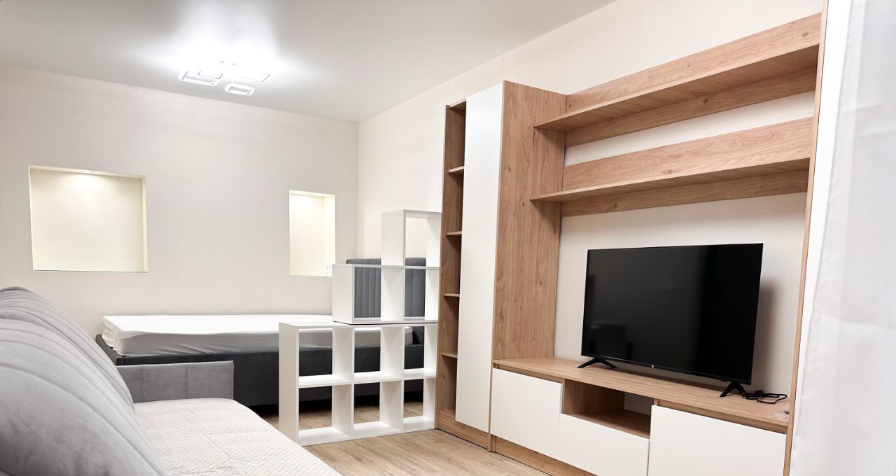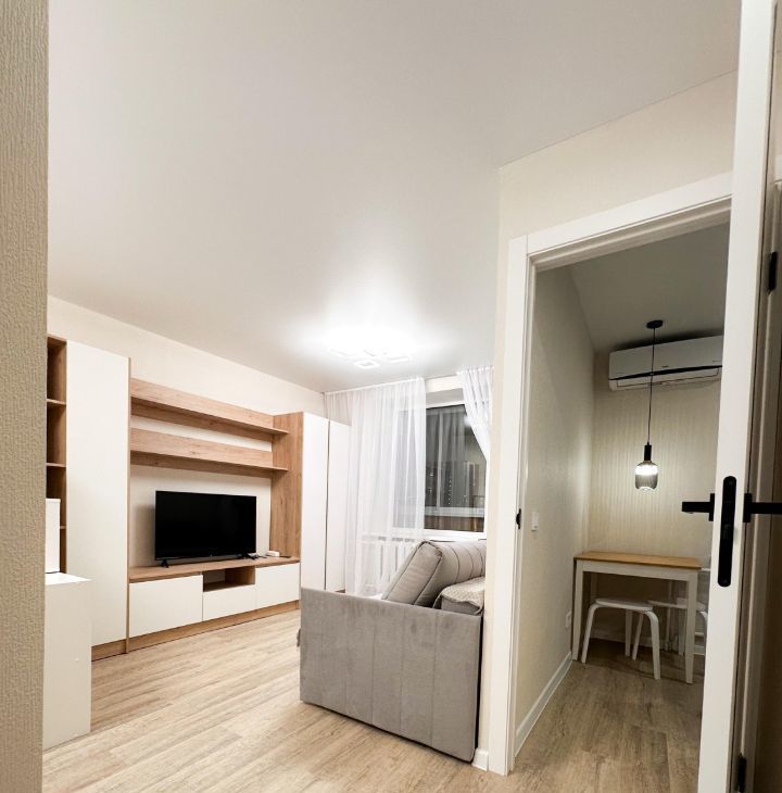 Функциональная планировка, оснащенная всем необходимым кухня, гостевая зона для отдыха и отдельная спальная зона, продуманная система хранения. Диван раскладывается, а в кровати есть подъемный механизм с местом для хранения.