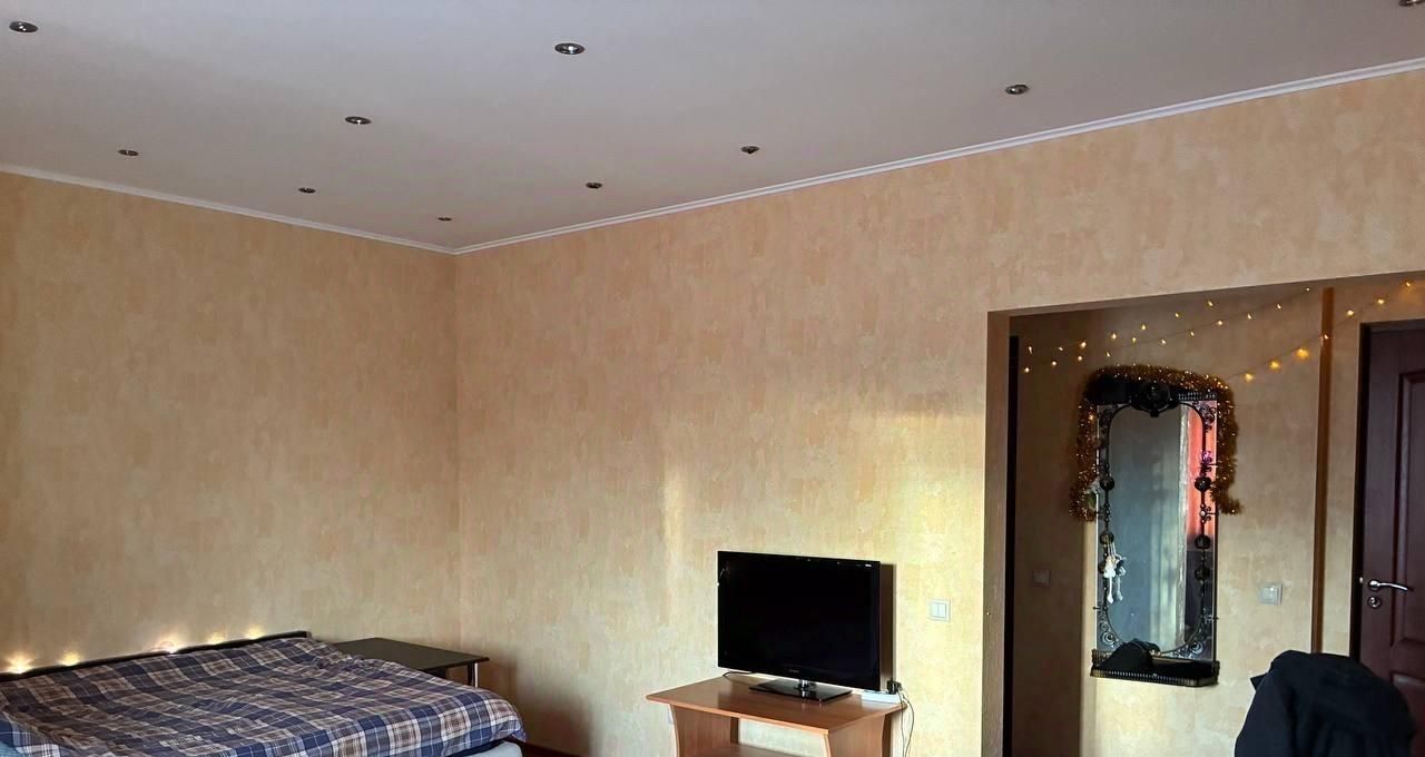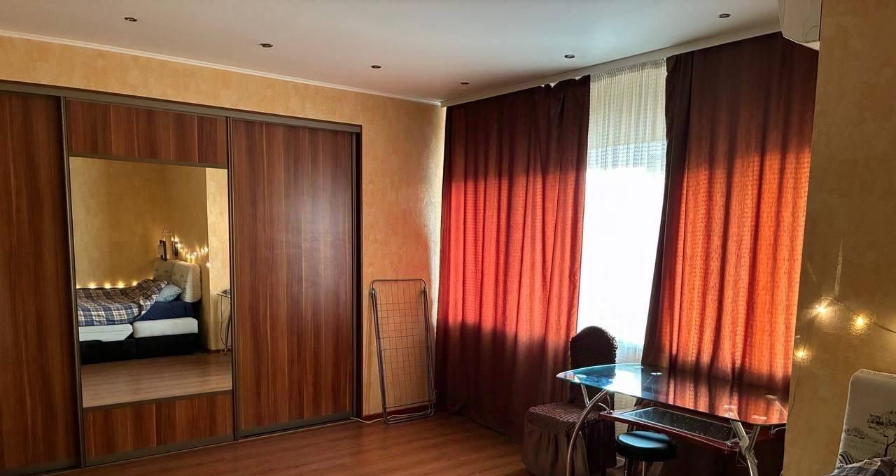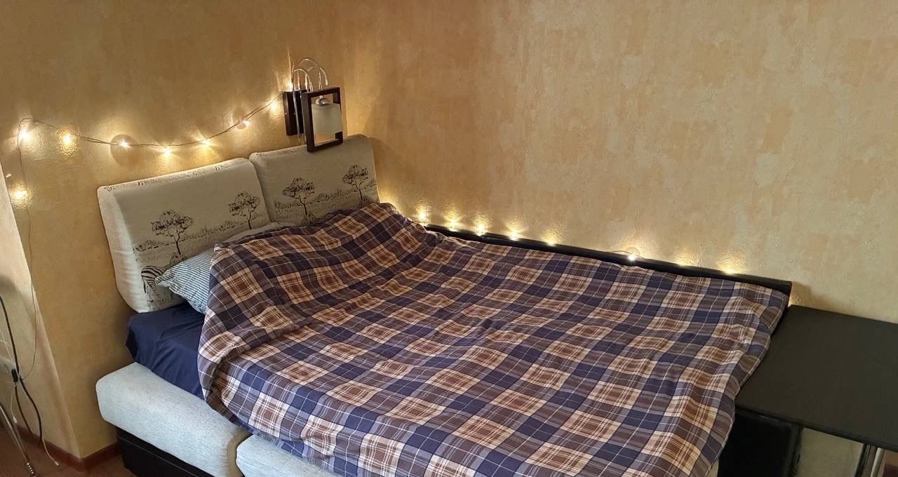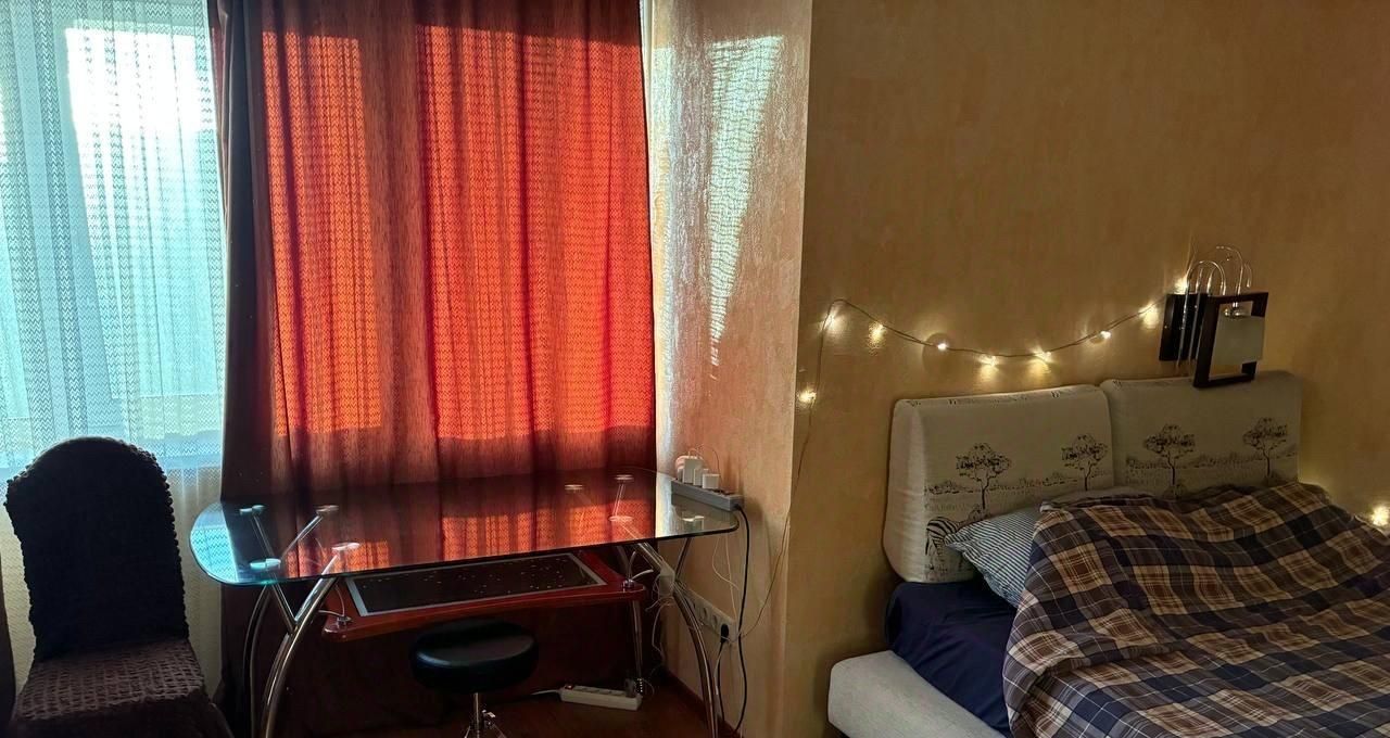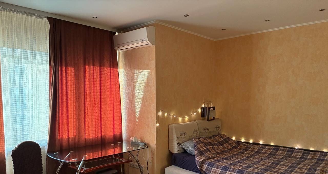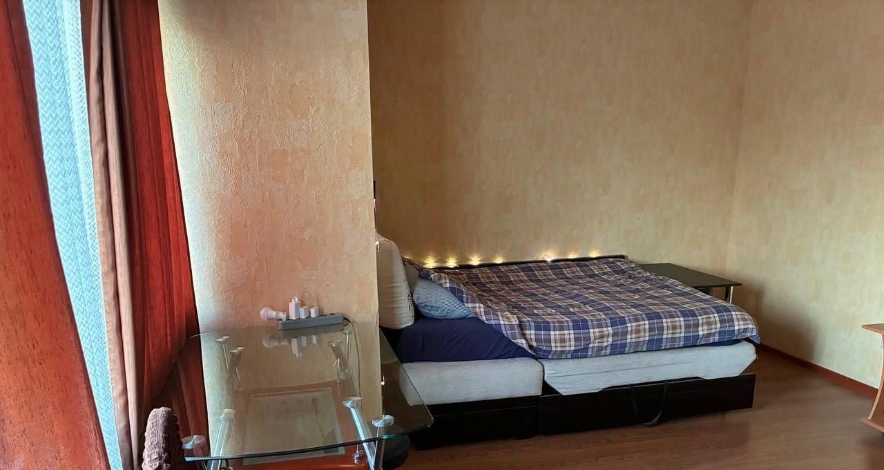 В спальне диван-кровать (сверху лежит матрас), предусмотрено рабочее место, ТВ зона, есть большой встроенный шкаф для хранения вещей.