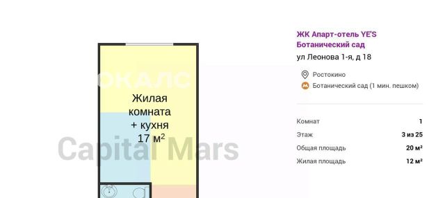Предлагается 1-комнатная квартира общей площадью 20 м² в ЖК "Апарт-отель YE'S Ботанический сад" недалеко от станции метро "Ботанический сад". Для комфортного проживания в наличии имеется вся необходимая мебель. Окна обращены на улицу.