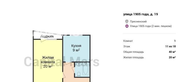 1-к кв. Москва ул. 1905 года, 19 (40.0 м²)