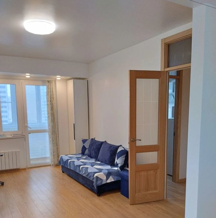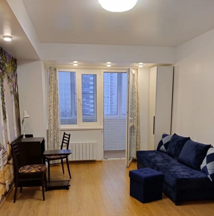 Очень хорошая планировка комнаты с двумя окнами и альковом. В алькове сделана спальня, в гостиной новый раскладной диван. Огромная застекленная лоджия на кухню и комнату с панорамным видом на площадь у метро Юго-западная.