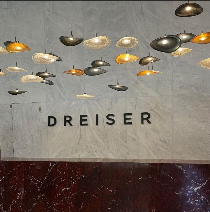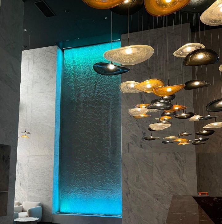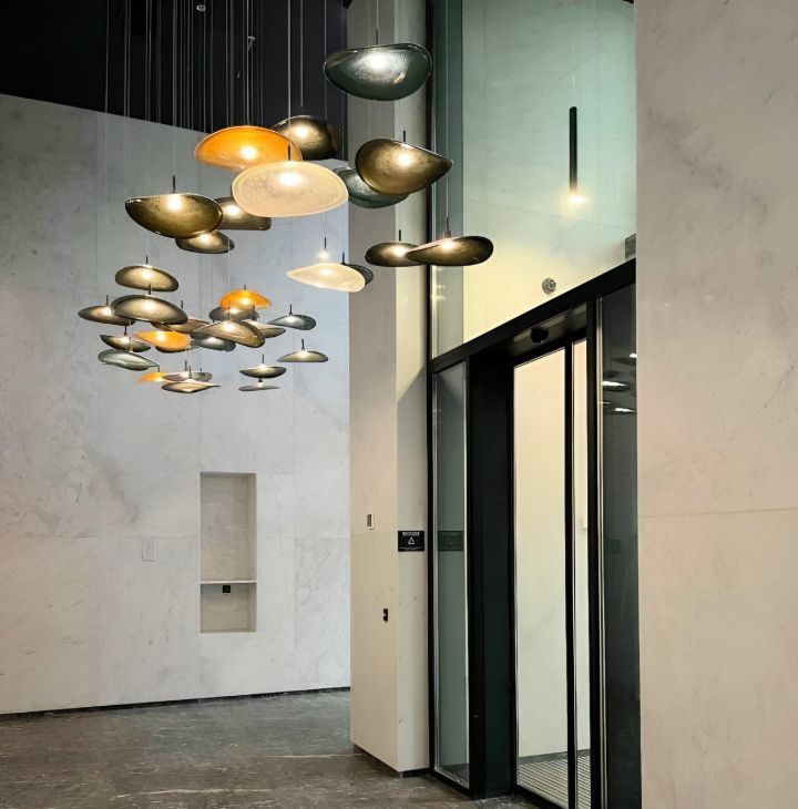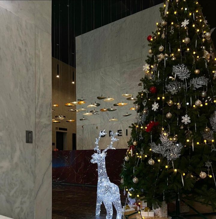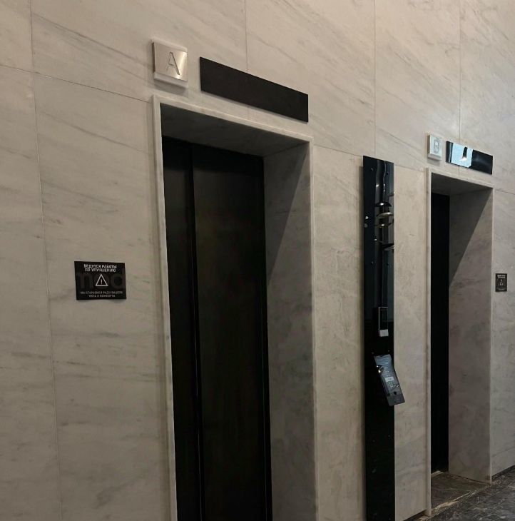 Просторное лобби полностью отделано натуральным мрамором, премиальные материалы, дизайнерское освещение.