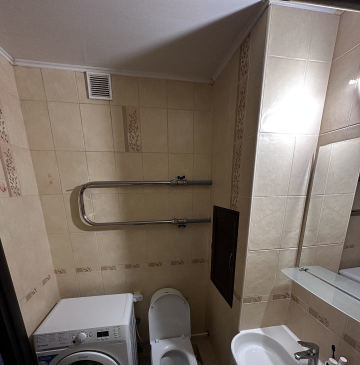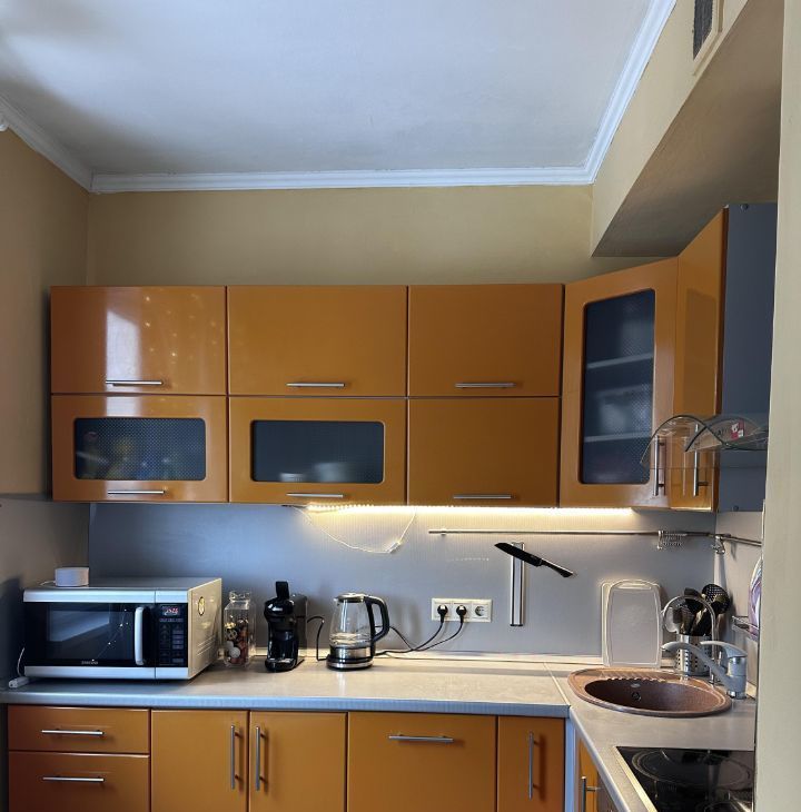 В квартире сделан современный ремонт. Обстановка включает всю необходимую мебель как на кухне, так и в комнате. В наличии вся необходимая бытовая техника: кондиционер, холодильник, электро-плита, микроволновка, посудомоечная и стиральная машина. Санузел совмещенный, с ванной. Есть балкон, окна выходят во двор. Интернет подключен.