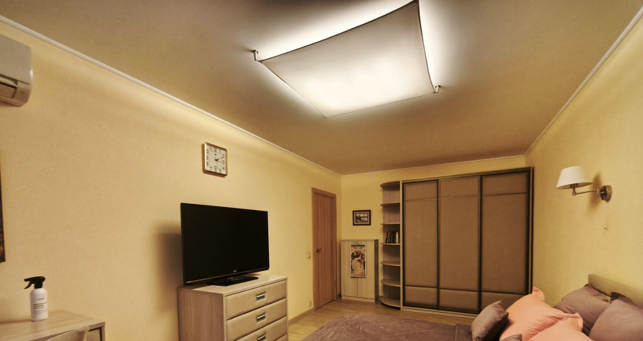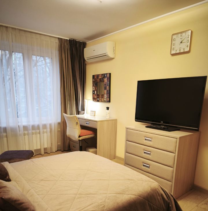 В комнате двухспальная кровать с подъемным механизмом, ортопедический матрас, большой ЖК телевизор, комод, мягкое кресло, рабочий стол, прикроватные тумбы, вместительный шкаф для одежды, встроенный шкаф КУПЕ с зеркалом в коридоре.