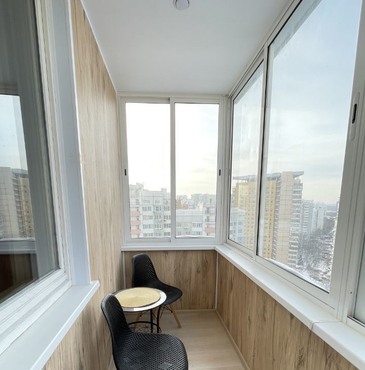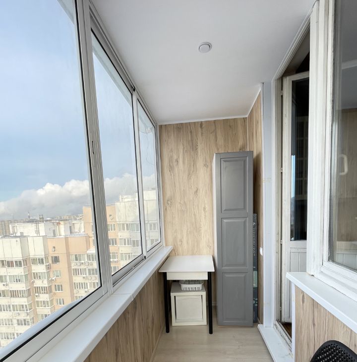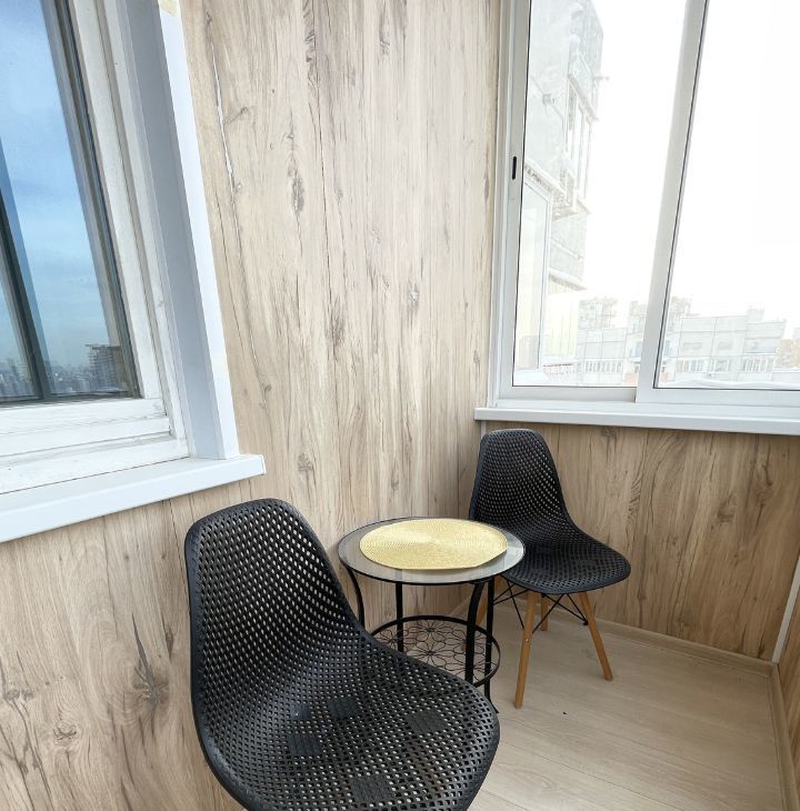 Вместительные системы хранения в прихожей, зона отдыха на одной из лоджий. Окна выходят в сторону двора, панорамный вид на закаты.