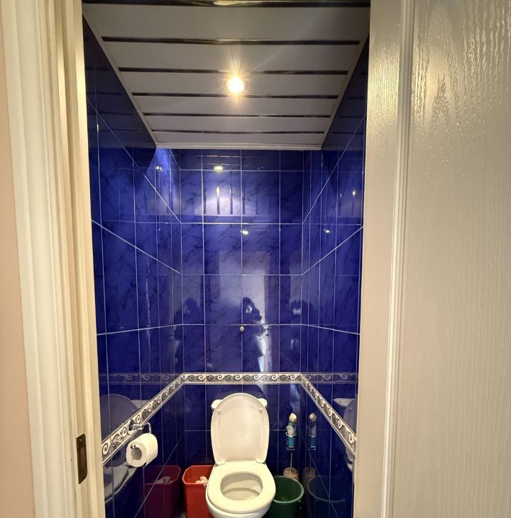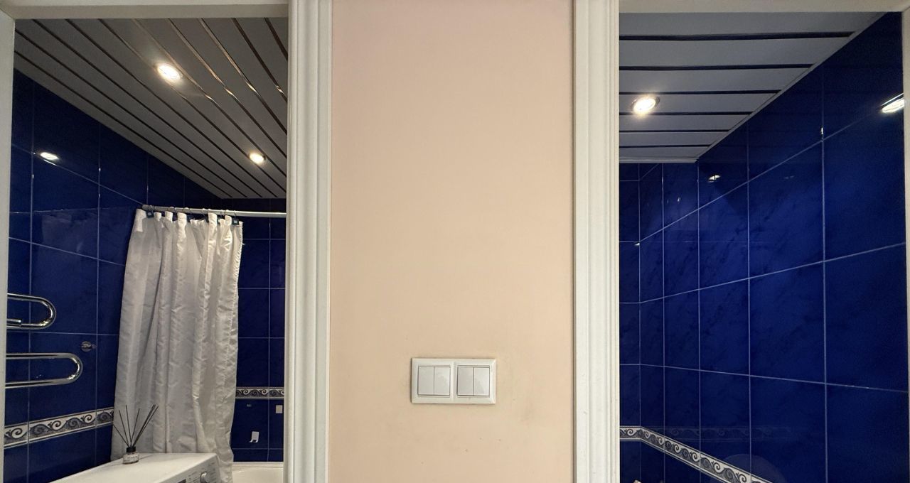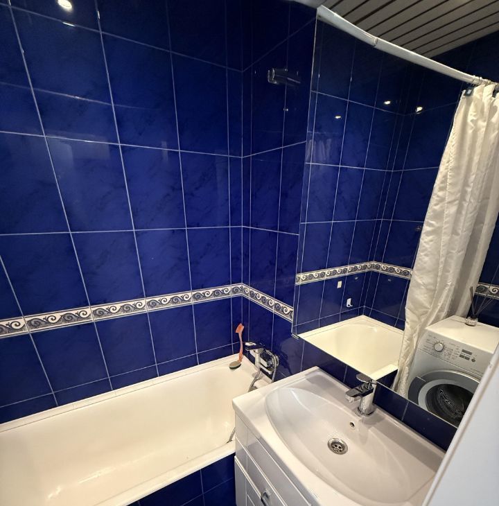 Санузел раздельный, оформлен плиткой в синих тонах. Есть балкон с панорамным видом на город.