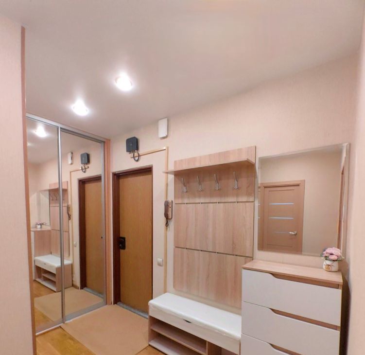 Просторная комната площадью почти 20 м², где с легкостью разместится как уютная зона отдыха, так и эргономичное рабочее место. В комнате уже есть — удобный диван-кровать, стильный комод с телевизором и огромный шкаф во всю стену с несколькими зеркальными фасадами, создающими ощущение простора. Для полного комфорта установлен современный кондиционер.