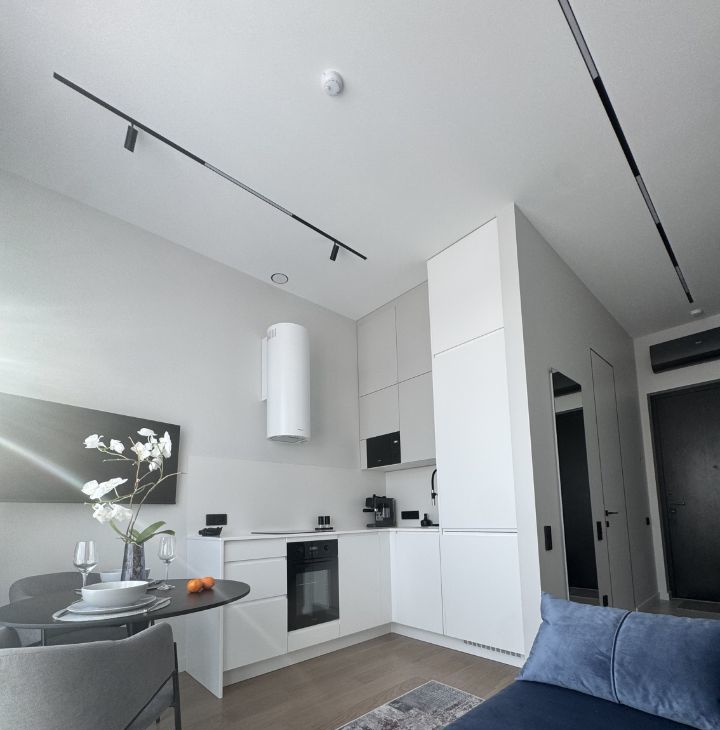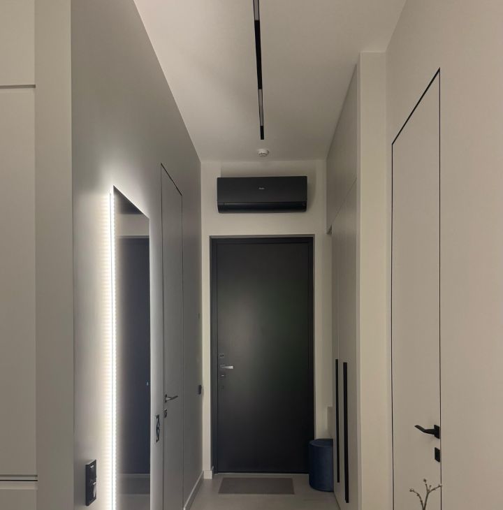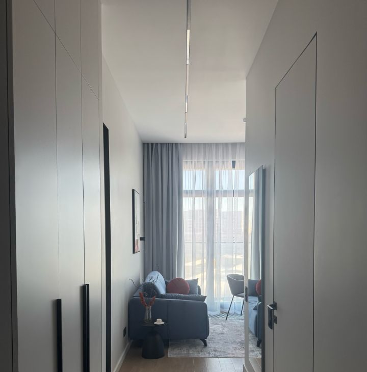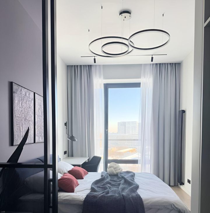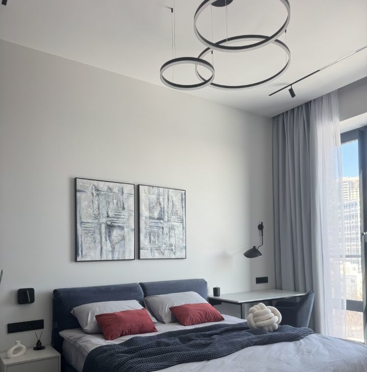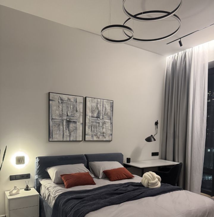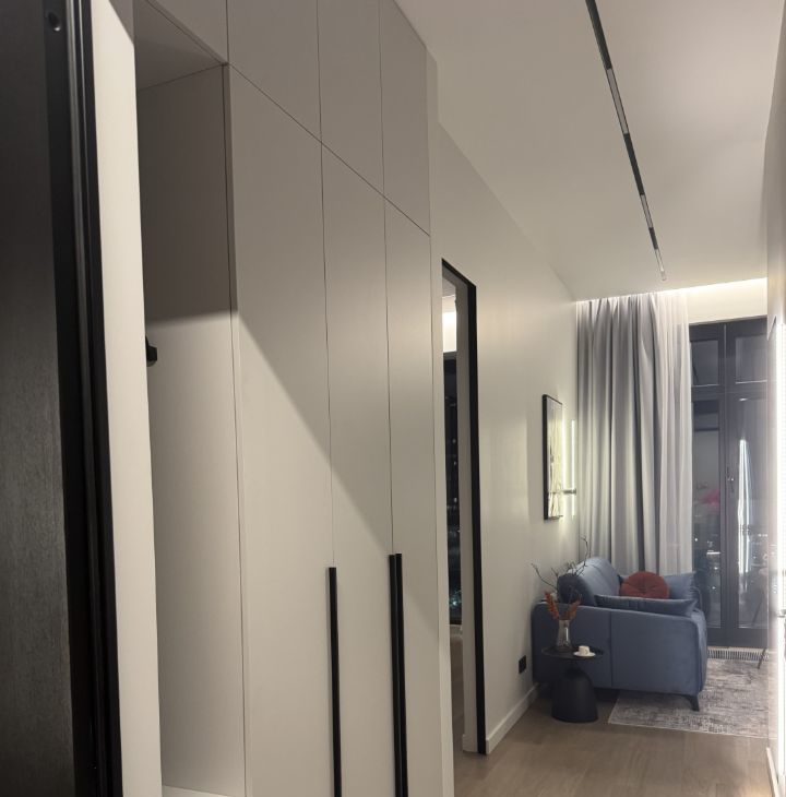 Окна в пол, много света, красивый вид на город (днем вы любуетесь на небо с облаками, вечером на огни города), высокие потолки 3,2 м, скрытые двери 2,5 м, инженерная доска (приятно ходить босиком по натуральному полу), сантехника Grohe, тропический душ, водонагреватель, теплый пол в коридоре и санузле, внутрипольные конвекторы+радиаторы (вы точно не замерзнете), много сценариев освещения, в т.ч. вечерняя уютная подсветка для расслабления и отдыха после трудового дня, прямые линии, серо-синие тона с черными элементами, визуальная простота, дизайнерский ремонт.