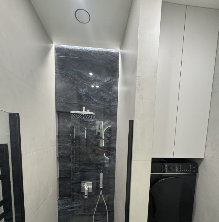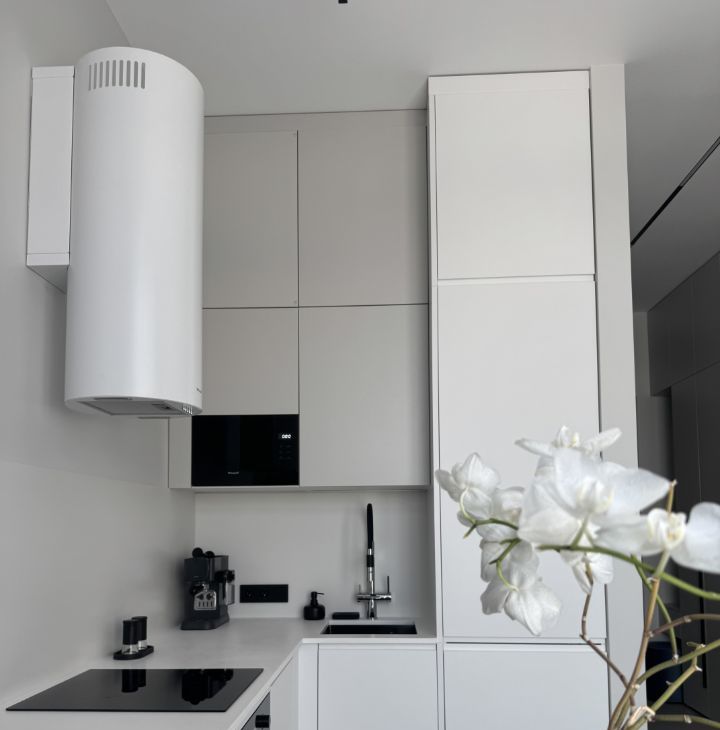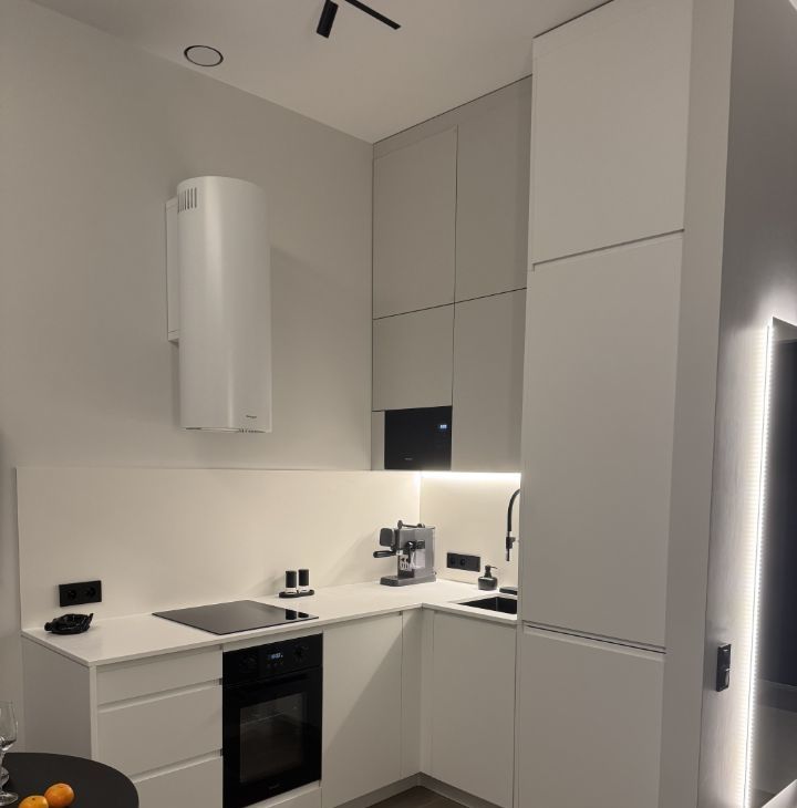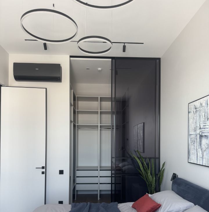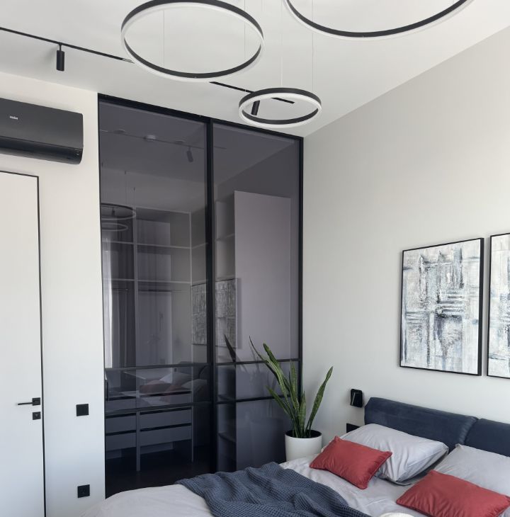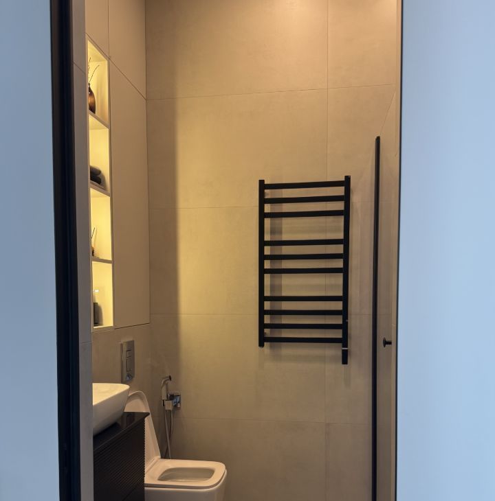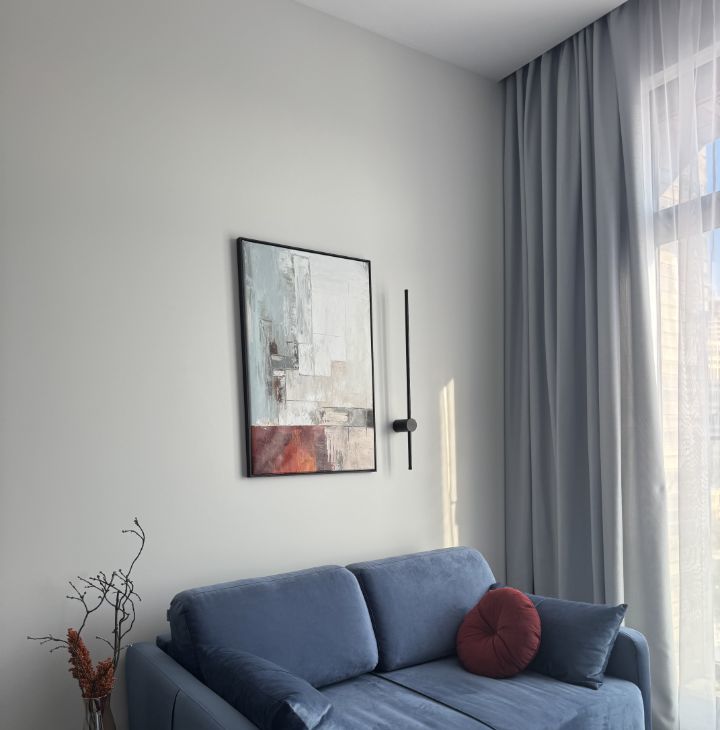 Окна в пол, много света, красивый вид на город (днем вы любуетесь на небо с облаками, вечером на огни города), высокие потолки 3,2 м, скрытые двери 2,5 м, инженерная доска (приятно ходить босиком по натуральному полу), сантехника Grohe, тропический душ, водонагреватель, теплый пол в коридоре и санузле, внутрипольные конвекторы+радиаторы (вы точно не замерзнете), много сценариев освещения, в т.ч. вечерняя уютная подсветка для расслабления и отдыха после трудового дня, прямые линии, серо-синие тона с черными элементами, визуальная простота, дизайнерский ремонт.