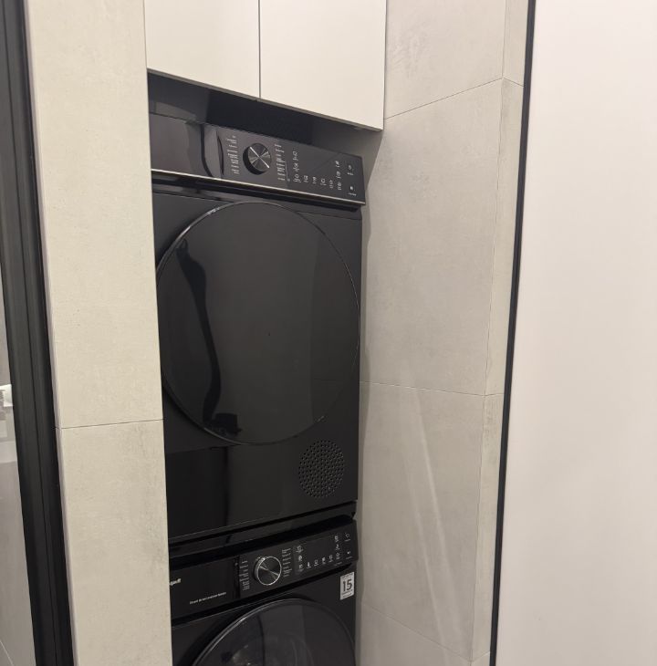 - В санузле колонна с сушильной и стиральной машинами. Сверху шкаф для хранения средств для стирки, таз, корзина для белья, водонагреватель