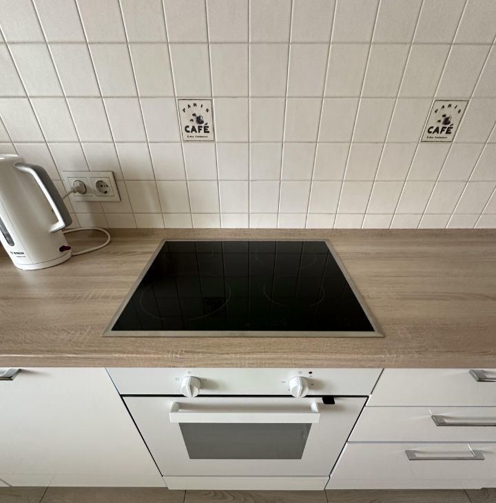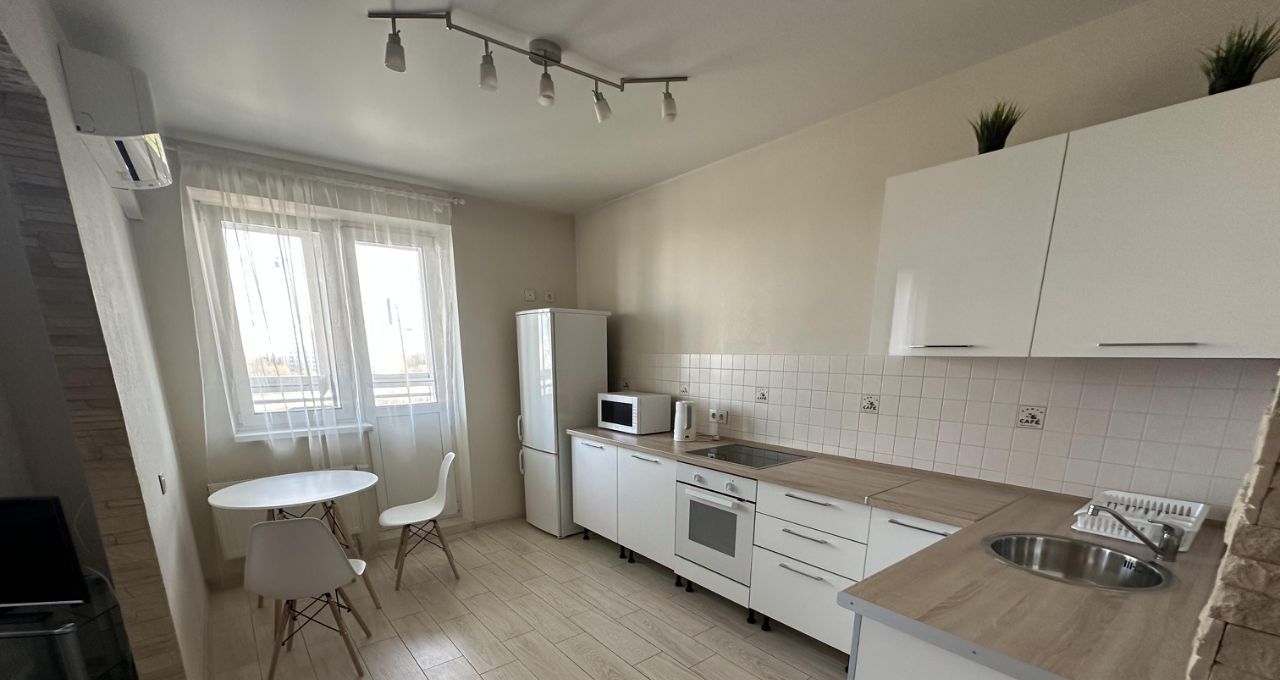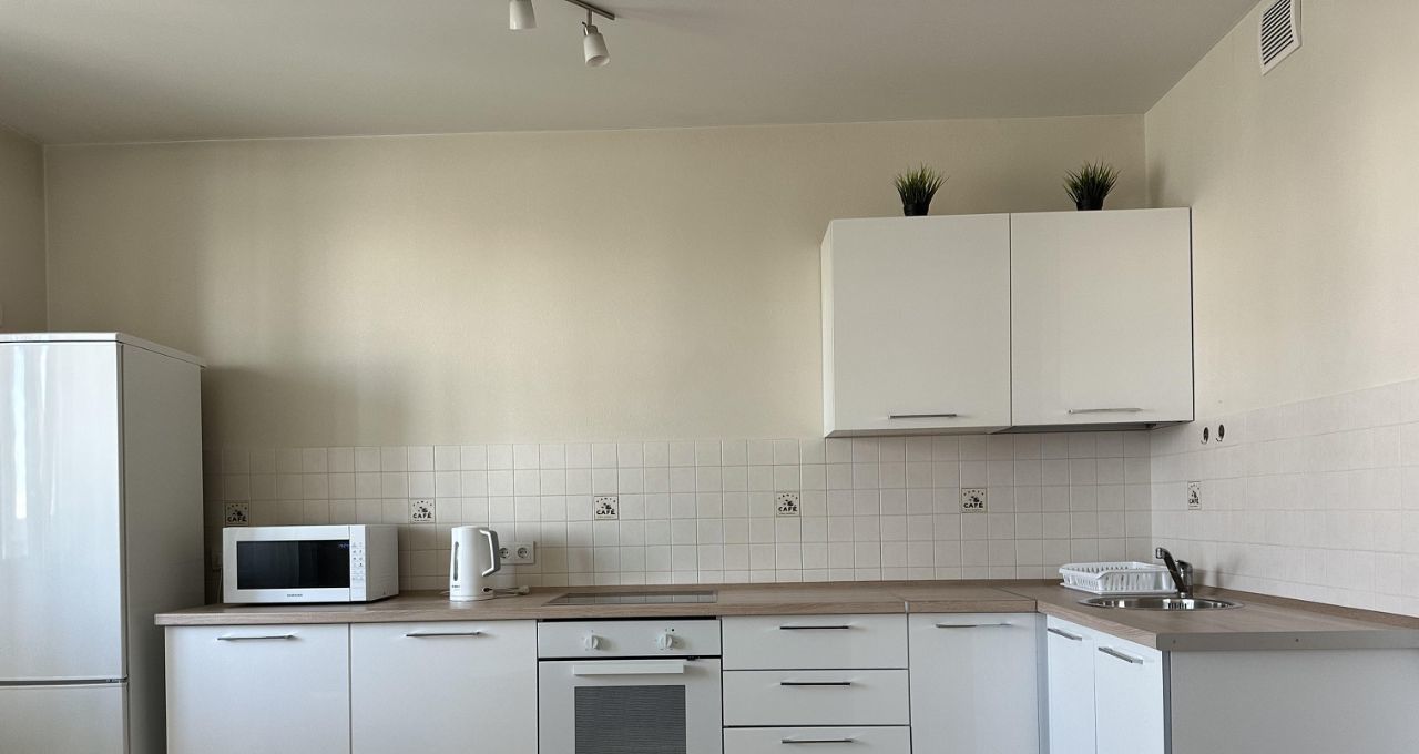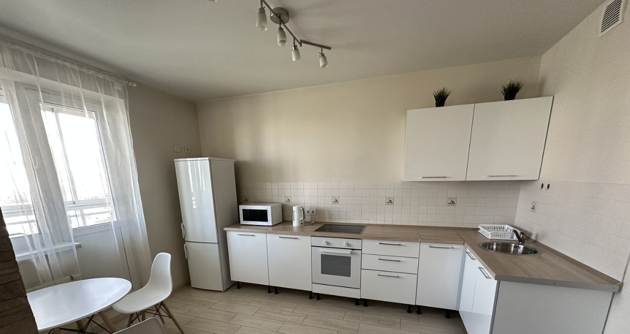 В квартире установлен новый кухонный гарнитур с техникой, стол со стульями, новый диван. В комнате есть необходимая для комфортного проживания бытовая техника: стиральная машина, холодильник, плита, микроволновая печь, электрический чайник, утюг.