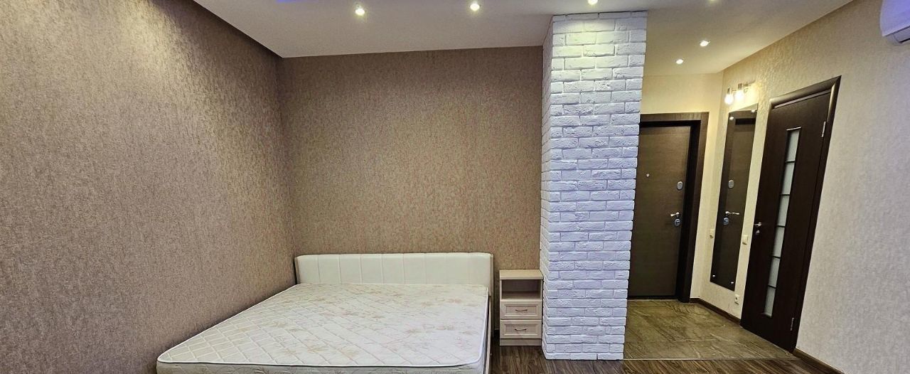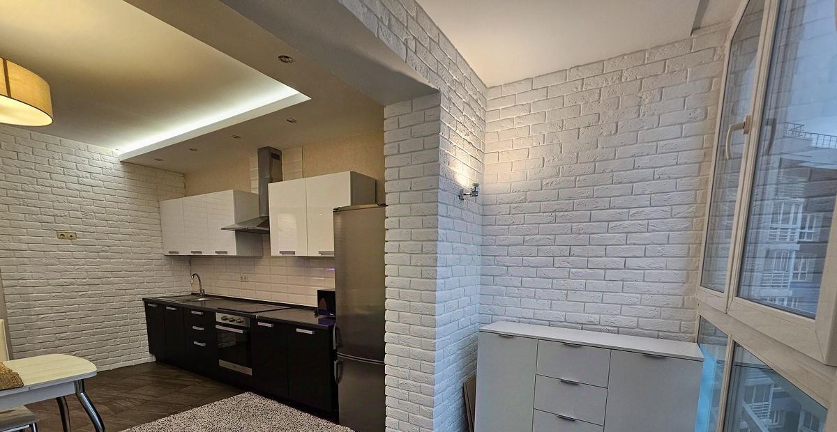В квартире выполнен качественный ремонт. Общая площадь 47 кв м, комната 21.5 кв м, кухня 16 кв м. Меблирована: встроенная кухня, вся бытовая техника, диван раскладной, двуспальная кровать и др. Панорамное остекление. Кондиционер. Гардеробная комната, с/у совмещён.