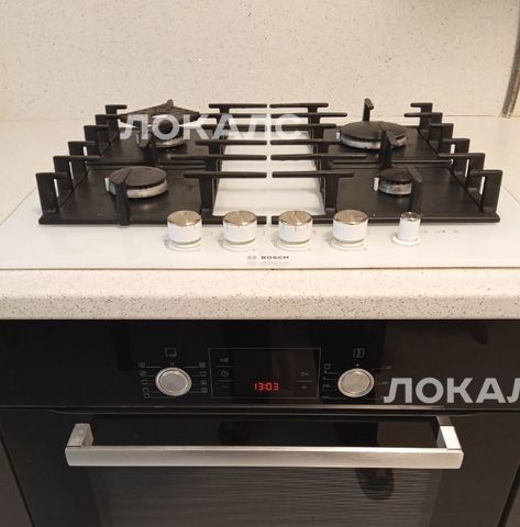 На кухне столешница и фартук из кварцевого камня, мойка с подстольным монтажом, варочная газовая панель. духовой шкаф и стиральная машина фирмы Bosch.