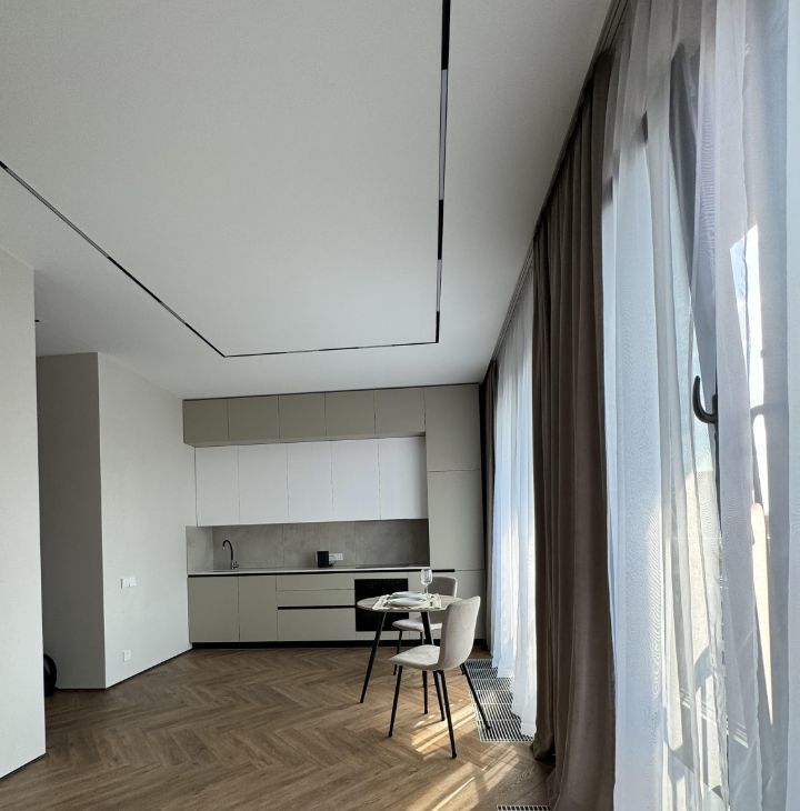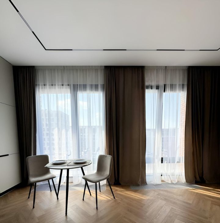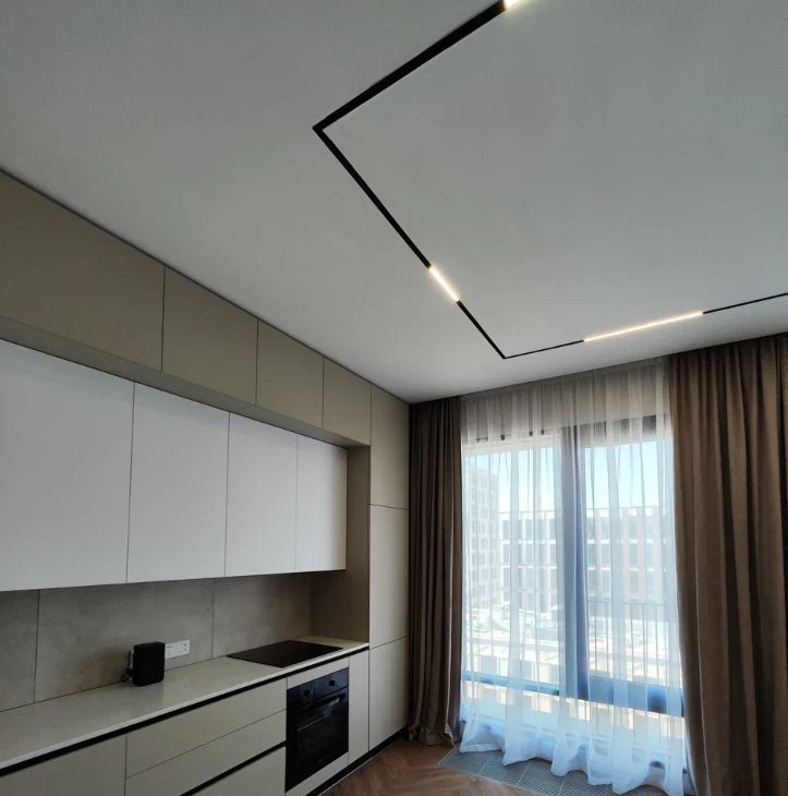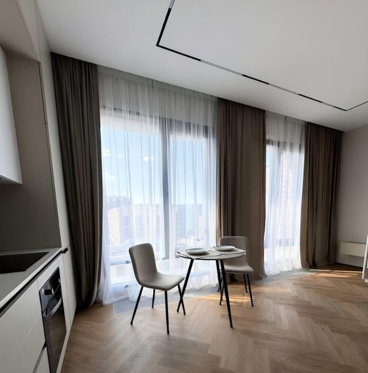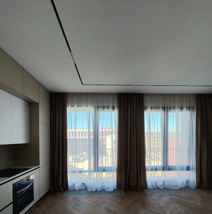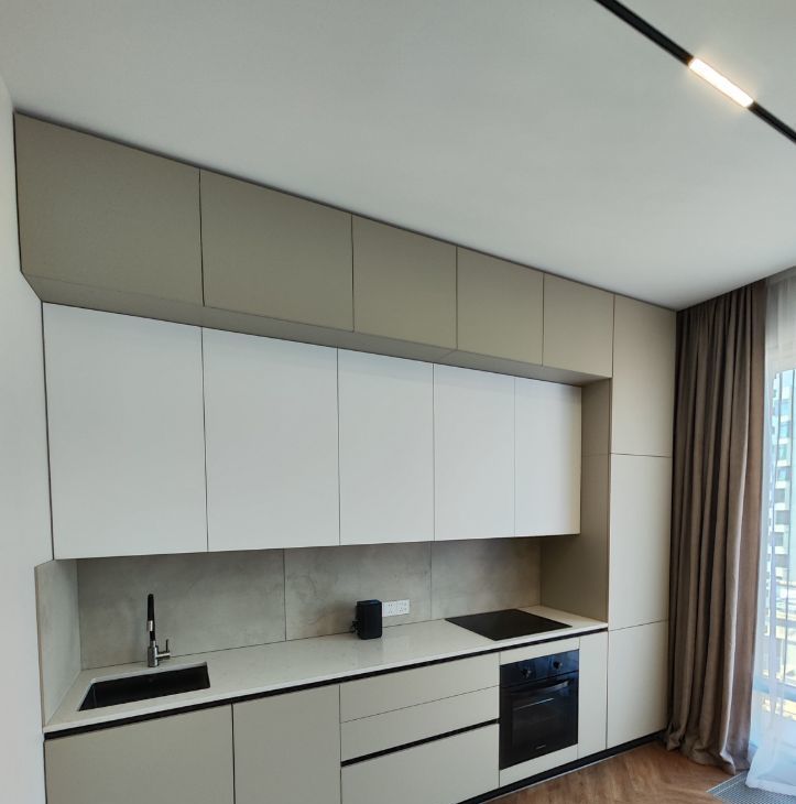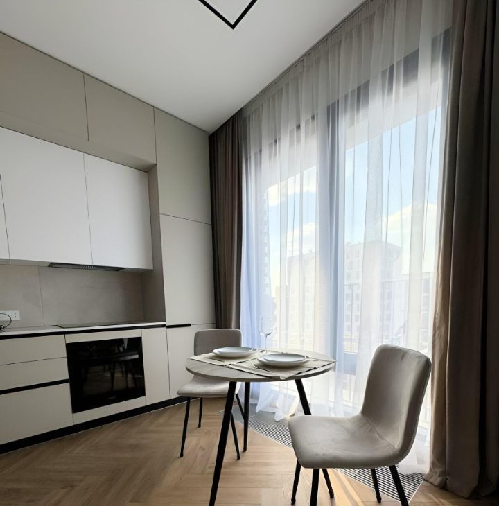Установлена кухня со всей техникой: холодильник, индукционная варочная панель, духовой шкаф, вытяжка и посудомойка, столешница сделана из натурального камня: кварцевый агломерат. В квартире 2 больших панорамных окна с отличным видом на жилой комплекс ЗилАрт (не окна в окна).